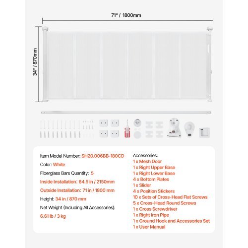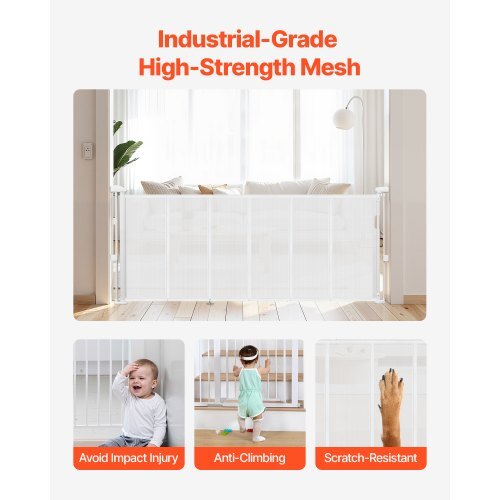 Retractable Baby Gate, 34 inch Tall, Extends up to 71 inch Wide, Retractable Gate for Kids or Pets, Mesh Material, Easy to Install for Indoor Stairs, Doorways, Hallways, Playrooms, White