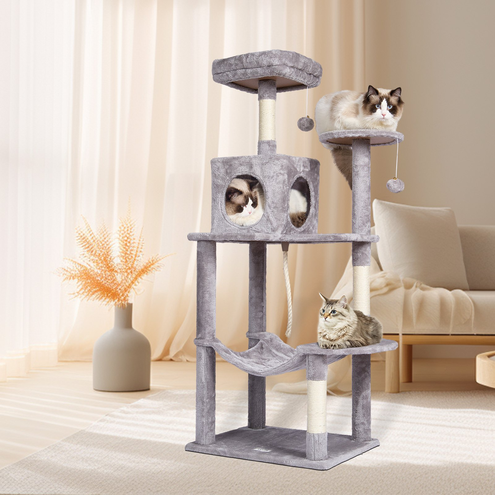 Bring endless entertainment and cozy comfort to your feline’s world with the VEVOR 56.2” Cat Tree for Indoor Cats — a multi-platform playground designed for climbing, lounging, and playtime fun. This elegant light grey cat tower blends seamlessly with modern home décor while providing a safe and engaging vertical environment for your cat to explore.