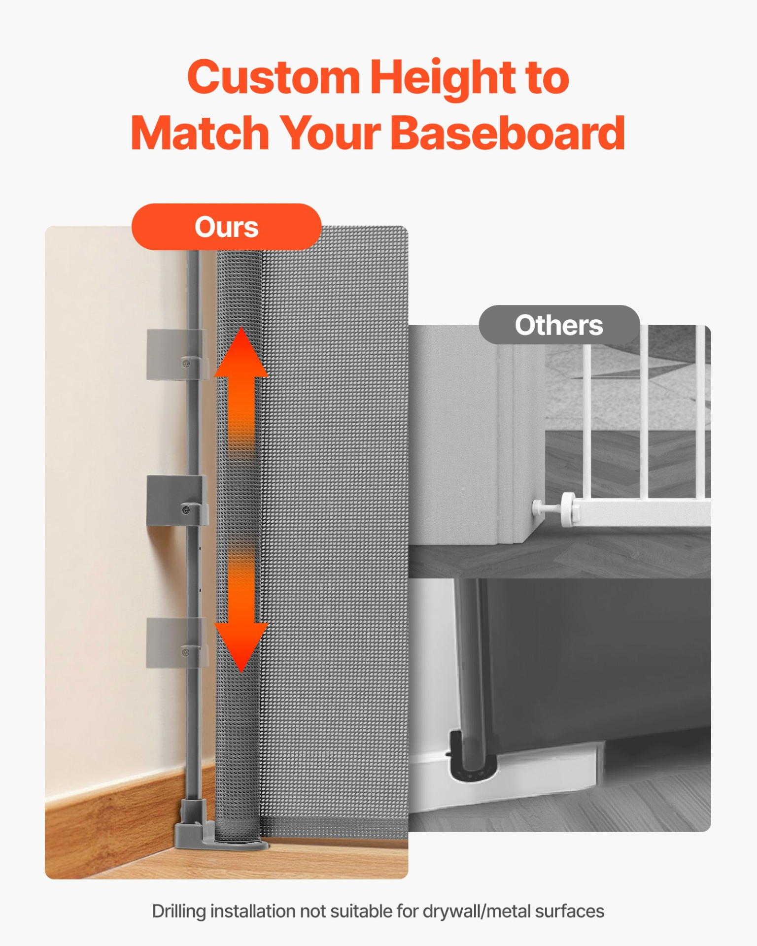 Keep your little ones and furry friends safe without compromising on convenience or style with the VEVOR Retractable Baby Gate. Designed for both babies and pets, this durable mesh safety gate extends up to 56.3 inches wide and 31.3 inches tall, making it perfect for doorways, hallways, and staircases. The transparent mesh ensures you can easily monitor activity while maintaining airflow and visibility.