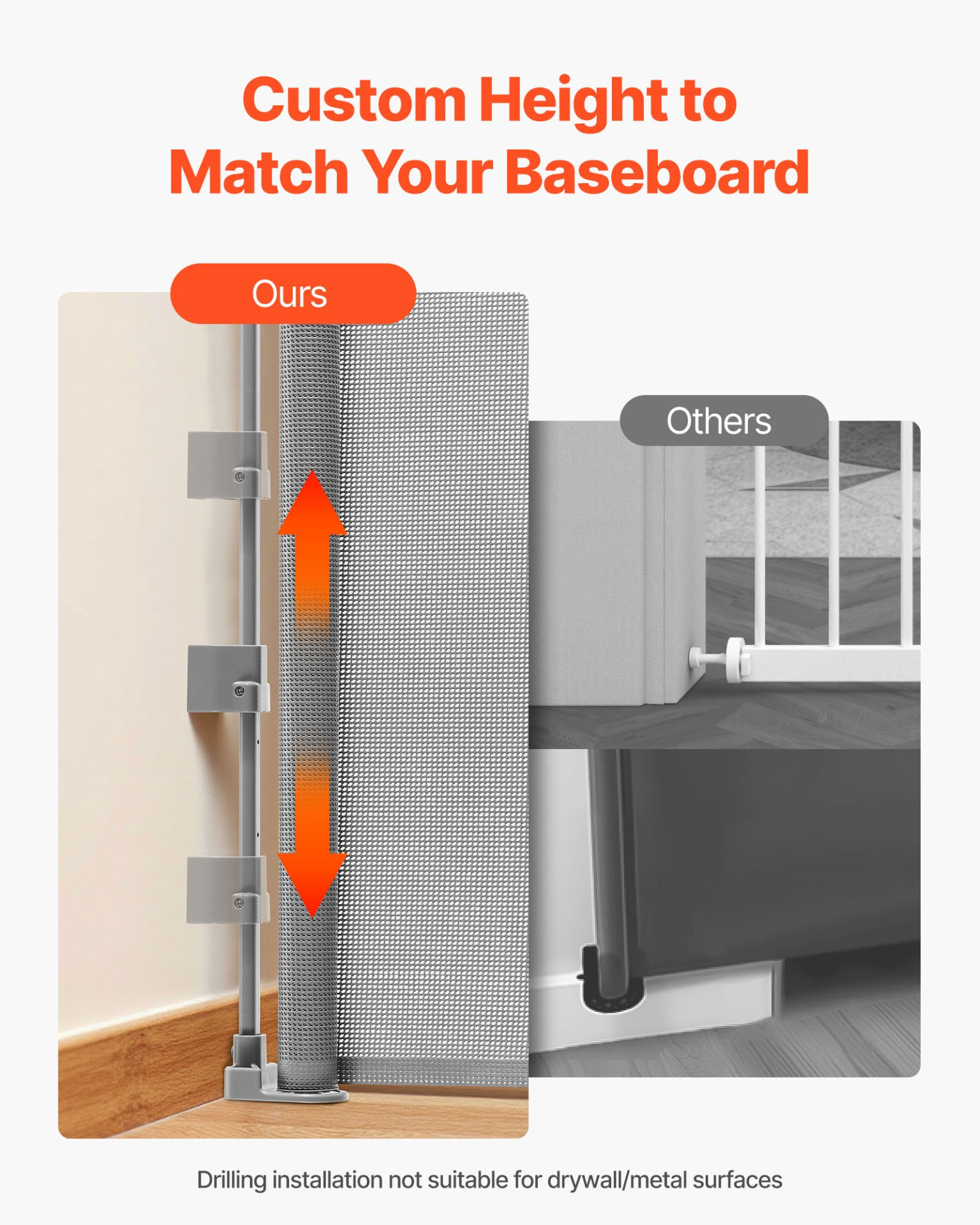 Keep your little ones and furry friends safe without sacrificing style with the VEVOR Retractable Baby Gate — a sleek, space-saving solution designed for both babies and pets. Extending up to 57 inches wide and standing 38.5 inches tall, this gate features a transparent yet sturdy mesh for easy visibility, making supervision simple while maintaining a clean, modern look.