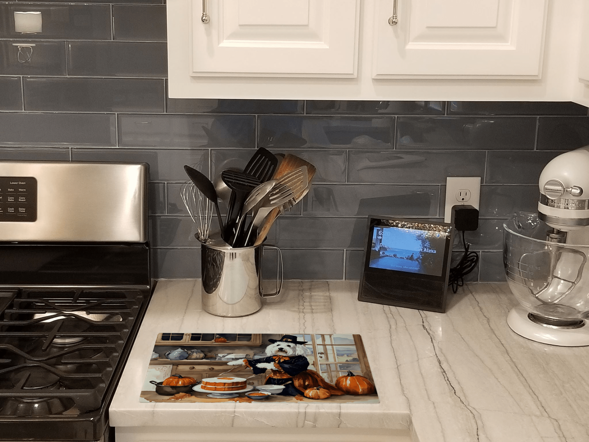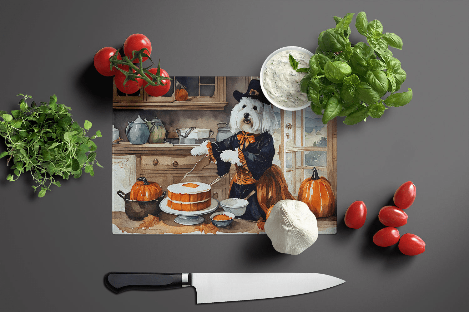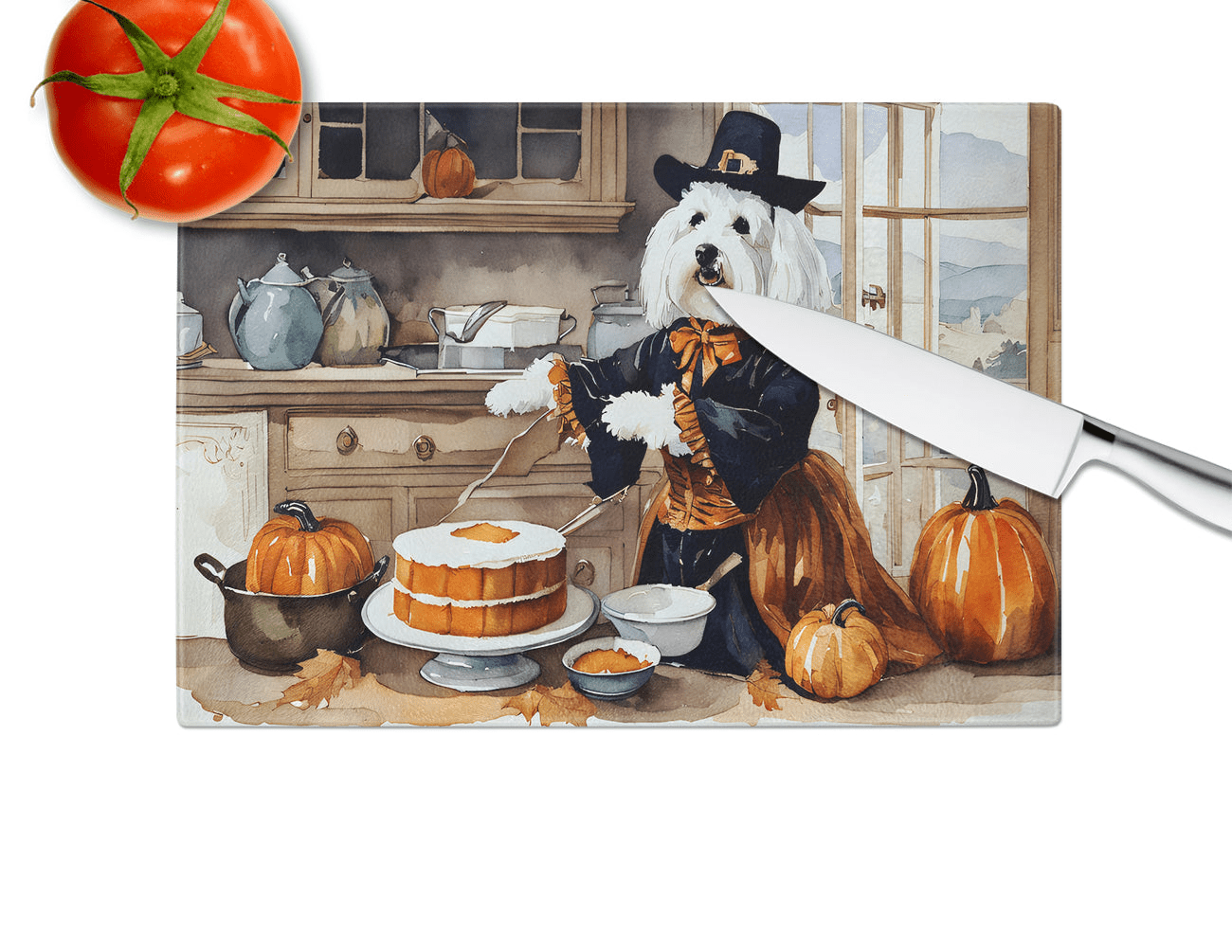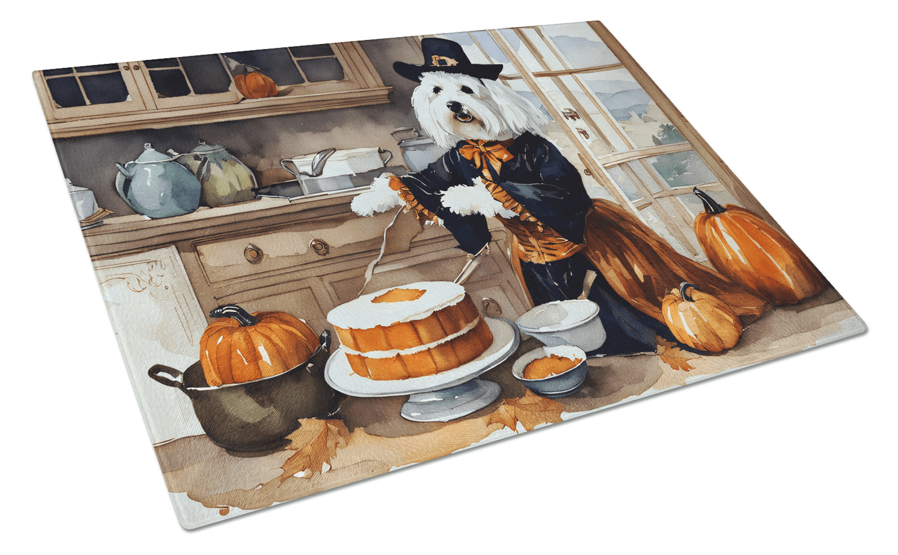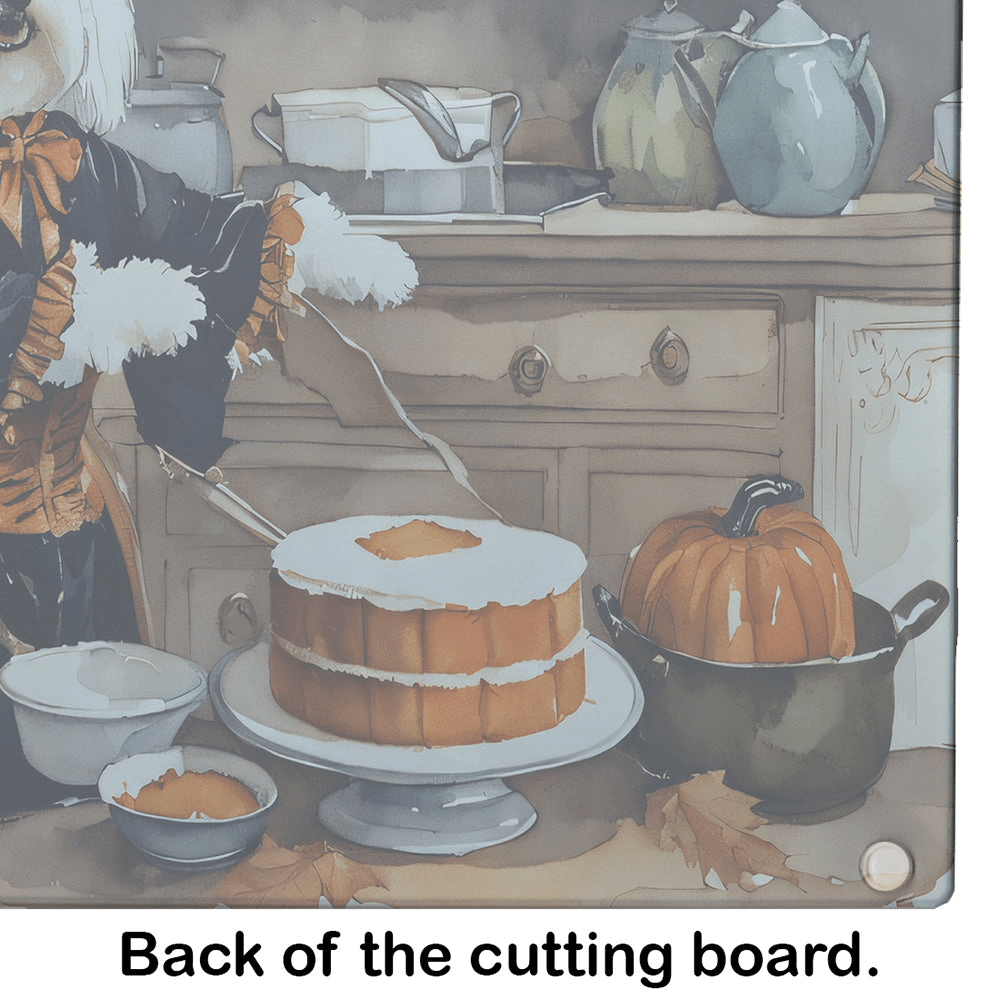 Tabla de cortar de vidrio con calabazas de otoño de Coton De Tulear