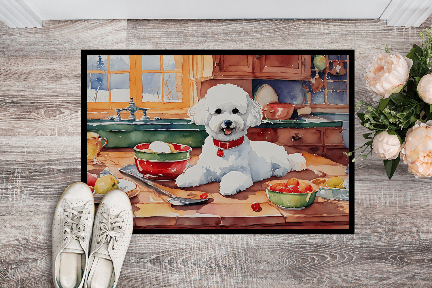 Felpudo con diseño de la raza Bichón Frisé. Celebra la Navidad con este felpudo navideño. Recibe a tus invitados con estilo con nuestro felpudo con diseño, diseñado para resistir prácticamente cualquier condición climática. Este felpudo, de aproximadamente 60 x 90 cm, está unido con una resistente cinta adhesiva negra. Su capa superior, de fieltro de poliéster, está teñida con la llamativa imagen que se ve en el felpudo. Las capas inferiores le proporcionan estabilidad, mientras que su base de goma está estampada para evitar resbalones y garantizar la seguridad. Nuestro felpudo funciona de maravilla tanto para interiores como para exteriores. Para limpiarlo, simplemente lávalo con agua a presión o con una hidrolavadora; no necesitas limpiadores que produzcan espuma. Evita frotar con un cepillo; en su lugar, opta por la función de aspiración en el suelo. Diseñado, fabricado e impreso en EE. UU., este felpudo es el complemento perfecto para tu porche, cocina exterior, entrada o cualquier espacio interior. Su diseño único lo convierte en una encantadora alfombra decorativa que da la bienvenida a tus invitados y añade un toque de estilo a la decoración de tu hogar.