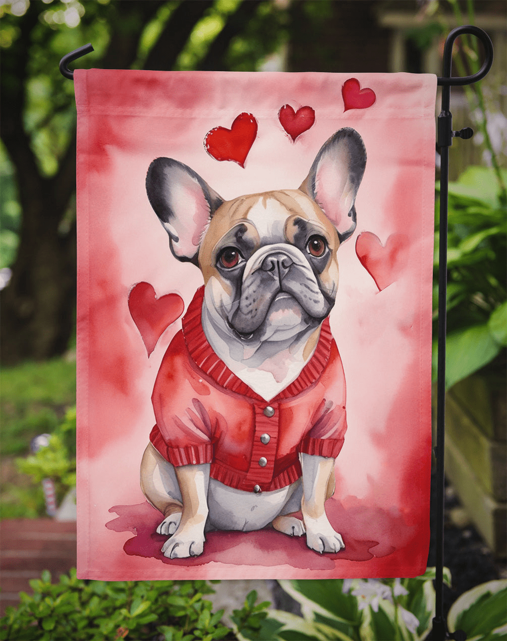 Bandera de jardín con diseño de Bulldog Francés. Celebra San Valentín con esta bandera. Realza la belleza de tu jardín o patio con la bandera decorativa Caroline's Treasures, fabricada con orgullo en EE. UU. Fabricada con dos piezas de poliéster grueso de doble cara, esta bandera de jardín de dos capas está diseñada para resistir diversas condiciones climáticas, lo que la hace resistente al agua y a la intemperie. Con texto legible en ambos lados, esta bandera ofrece una experiencia visual encantadora desde cualquier ángulo. Su mayor peso la distingue de otras banderas, garantizando estabilidad y durabilidad incluso con viento, lluvia y nieve. Con unas medidas aproximadas de 29,5 x 39,5 cm, esta bandera te permite personalizar tu decoración exterior. Incluye una funda de 3,8 cm cosida, que permite colocarla fácilmente en cualquier soporte estándar o colgador de porche (se vende por separado). Destaca en tu espacio exterior con la bandera decorativa Caroline's Treasures, una bandera vibrante y de alta calidad que añade color y personalidad a tu entorno. Fabricado con orgullo en EE. UU., es un símbolo de artesanía de calidad y atención al detalle.