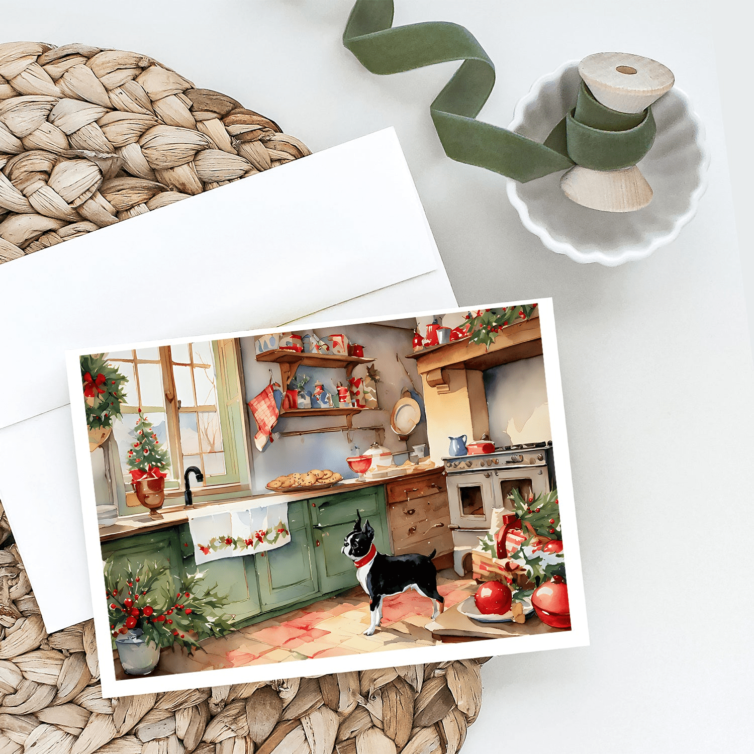 Paquete de 8 tarjetas de felicitación navideñas con diseño de Boston Terrier