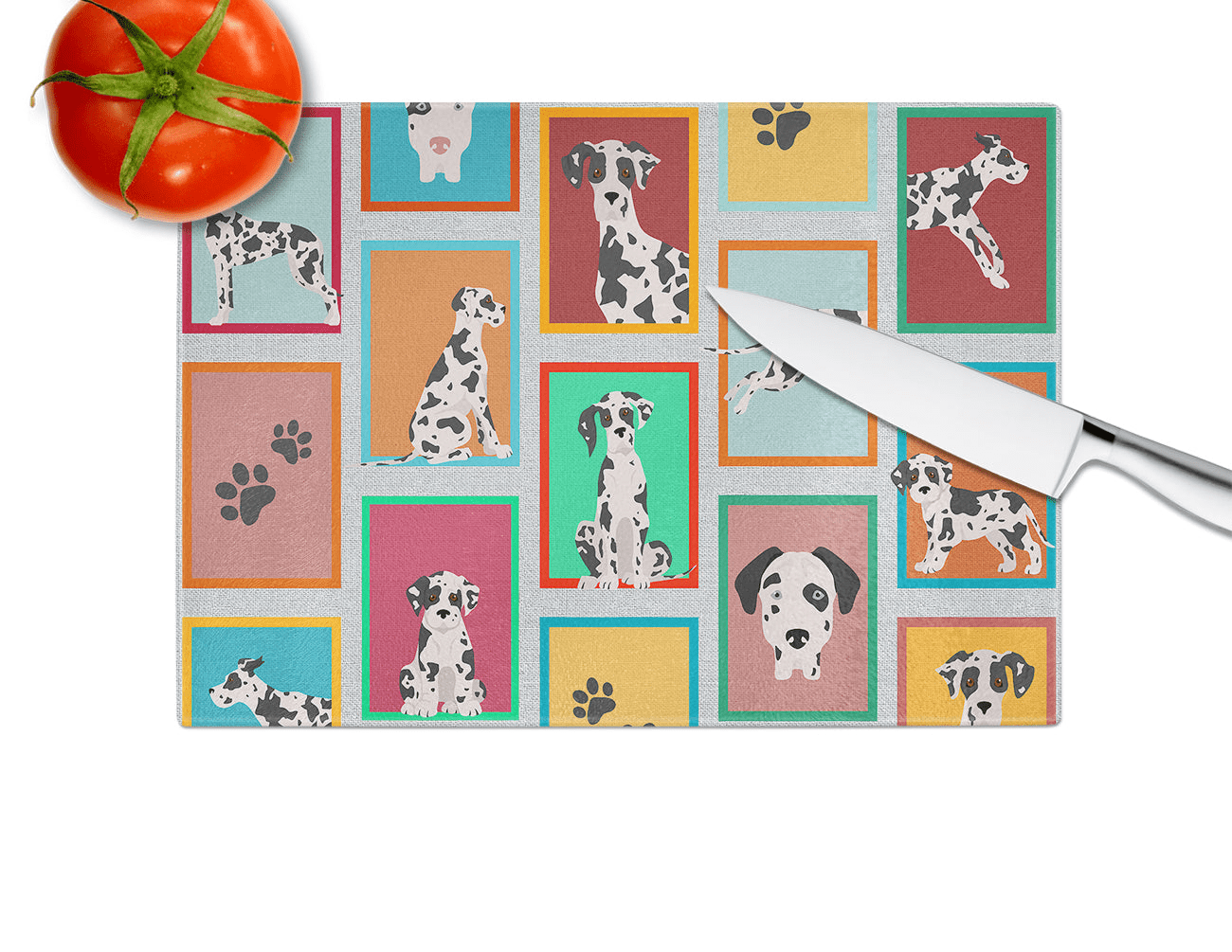 Tabla de cortar de vidrio con ilustraciones de la raza Gran Danés. Dale a tu cocina la vibrante y grande tabla de cortar de vidrio decorativa de Caroline's Treasures. Fabricada en resistente vidrio templado, esta tabla no solo es un accesorio práctico, sino también una colorida obra de arte. Con sus generosas dimensiones de 38 cm de alto y 30 cm de largo, ofrece amplio espacio para todas tus necesidades de corte. Cada pieza exhibe cautivadoras obras de arte de artistas distinguidos, aportando un toque estético a tu cocina. Además de su atractivo diseño, esta tabla de cortar garantiza que tu encimera se mantenga impecable gracias a sus propiedades de resistencia al calor. Diseñada pensando en la comodidad del usuario, cuenta con patas antideslizantes para mayor estabilidad y esquinas redondeadas para mayor seguridad. Su robusta construcción la hace prácticamente irrompible, garantizando así una larga vida útil. La tabla incluye protectores para las patas que la mantienen en su lugar durante el uso. Se recomienda lavar a mano únicamente. Impresa y ensamblada con orgullo en Estados Unidos, esta tabla de cortar ejemplifica la artesanía superior. Con la tabla de cortar de vidrio decorativa de Caroline's Treasures, está invirtiendo en una combinación de funcionalidad y estilo artístico.
