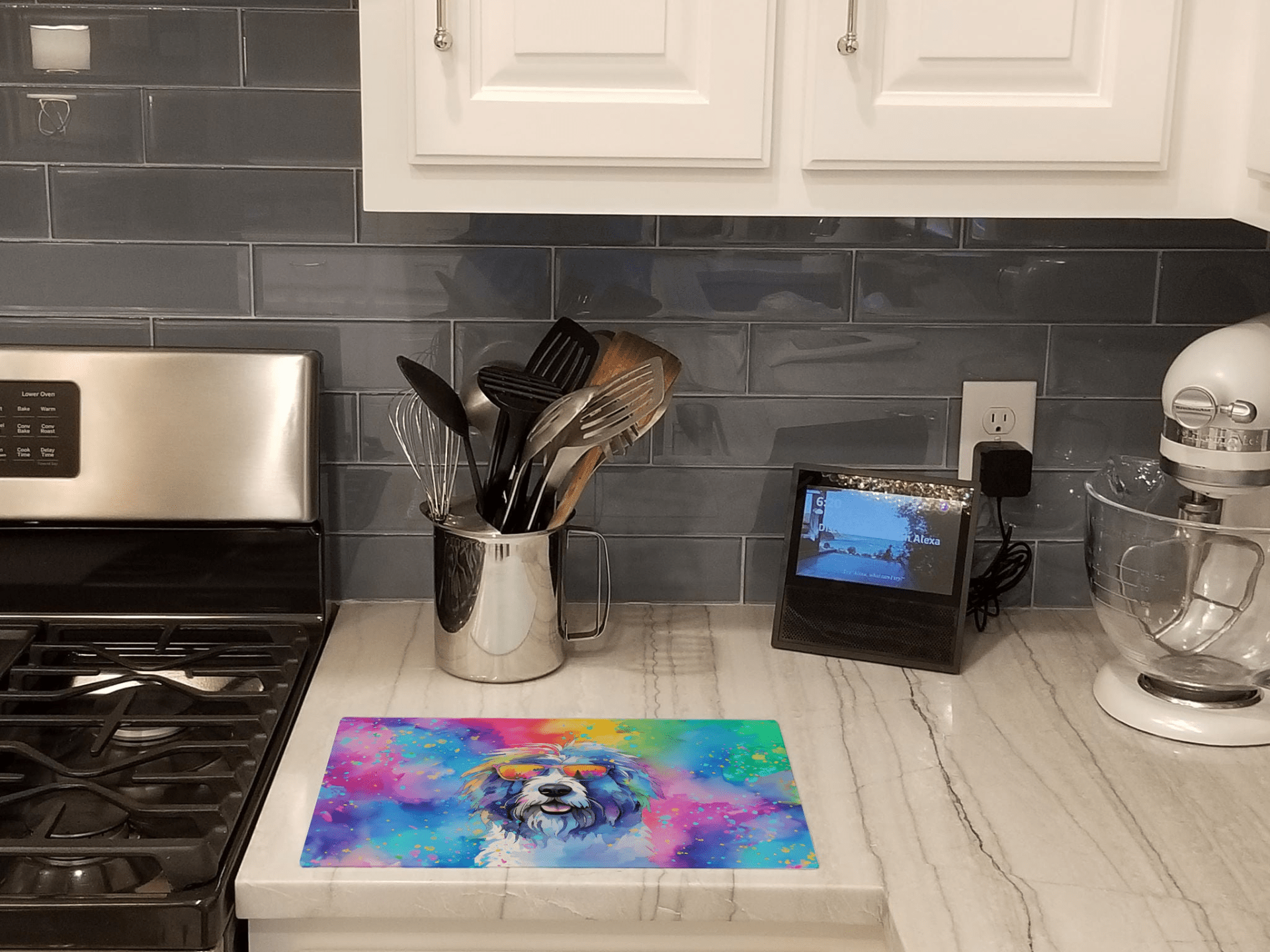 Tabla de cortar de vidrio con ilustraciones de la raza Old English Sheepdog. Dale a tu cocina la vibrante y grande tabla de cortar de vidrio decorativa de Caroline's Treasures. Fabricada con resistente vidrio templado, esta tabla no solo es un accesorio práctico, sino también una colorida obra de arte. Con sus generosas dimensiones de 38 cm de alto y 30 cm de largo, ofrece amplio espacio para todas tus necesidades de corte. Cada pieza exhibe cautivadoras obras de arte de artistas distinguidos, aportando un toque estético a tu cocina. Además de su atractivo diseño, esta tabla de cortar garantiza que tu encimera se mantenga impecable gracias a sus propiedades de resistencia al calor. Diseñada pensando en la comodidad del usuario, cuenta con patas antideslizantes para mayor estabilidad y esquinas redondeadas para mayor seguridad. Su robusta construcción la hace prácticamente irrompible, garantizando así una larga vida útil. La tabla incluye protectores para las patas que la mantienen en su lugar durante el uso. Se recomienda lavar a mano únicamente. Impresa y ensamblada con orgullo en Estados Unidos, esta tabla de cortar ejemplifica la artesanía superior. Con la tabla de cortar de vidrio decorativa de Caroline's Treasures, está invirtiendo en una combinación de funcionalidad y estilo artístico.