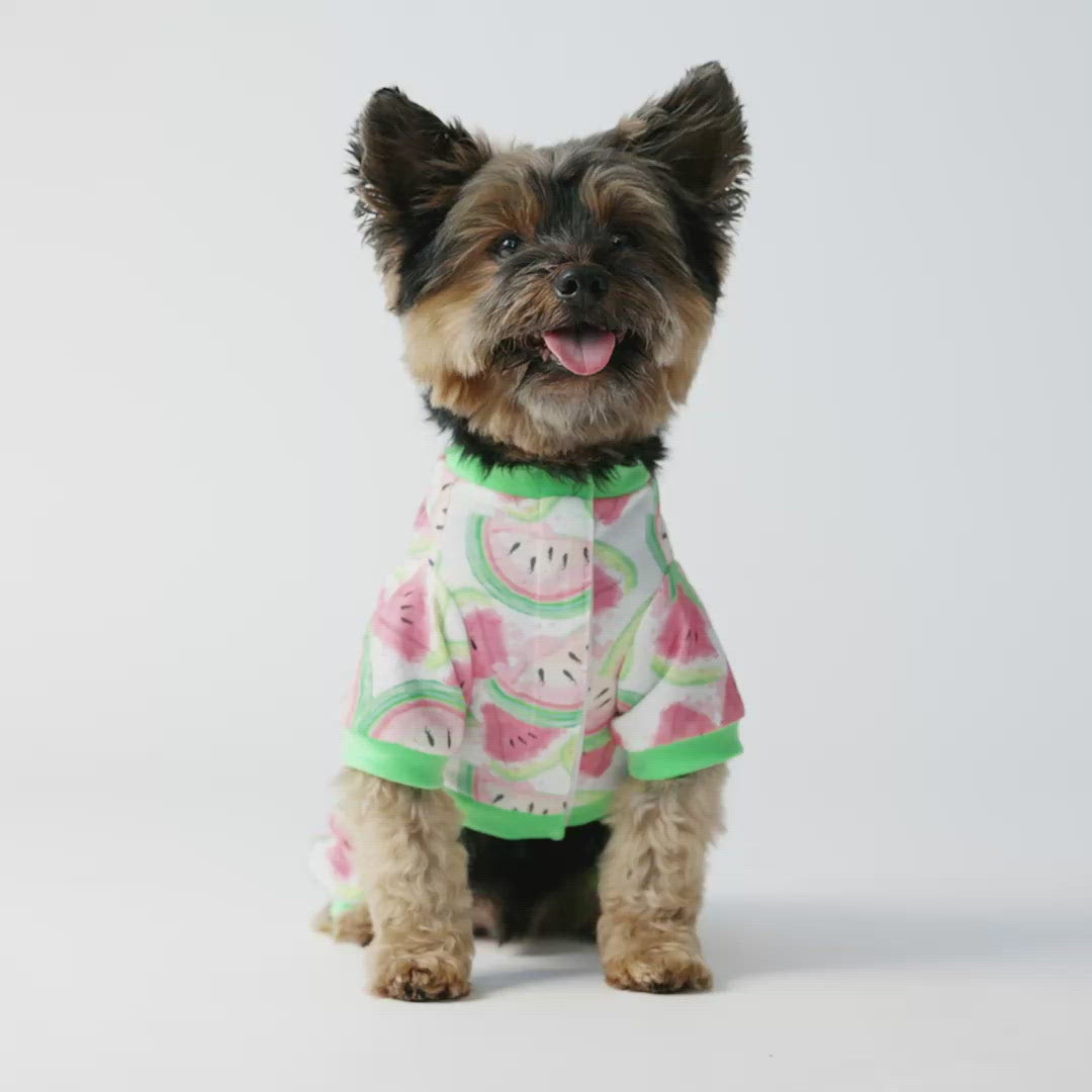 Dress your pup in sweet summertime vibes with these Watermelon Fruit Dog Pajamas! Designed with a vibrant watermelon print, contrast ribbing, and adorable non-functional buttons, this onesie is perfect for snuggly naps, lounging, and cute pet photos.