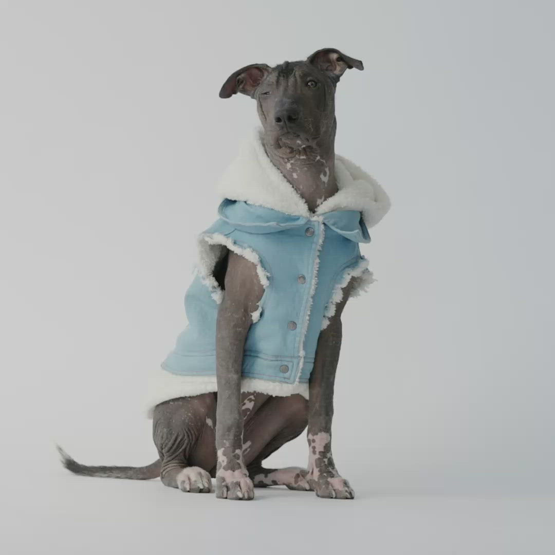 Give your pup major street-style vibes with the Justin Denim Dog Jacket. Featuring a distressed denim look, a cozy Sherpa lining, and a stylish hood, this jacket keeps your dog warm and effortlessly cool. Whether you're heading for a casual walk or a trendy photoshoot, your pup will be turning heads!