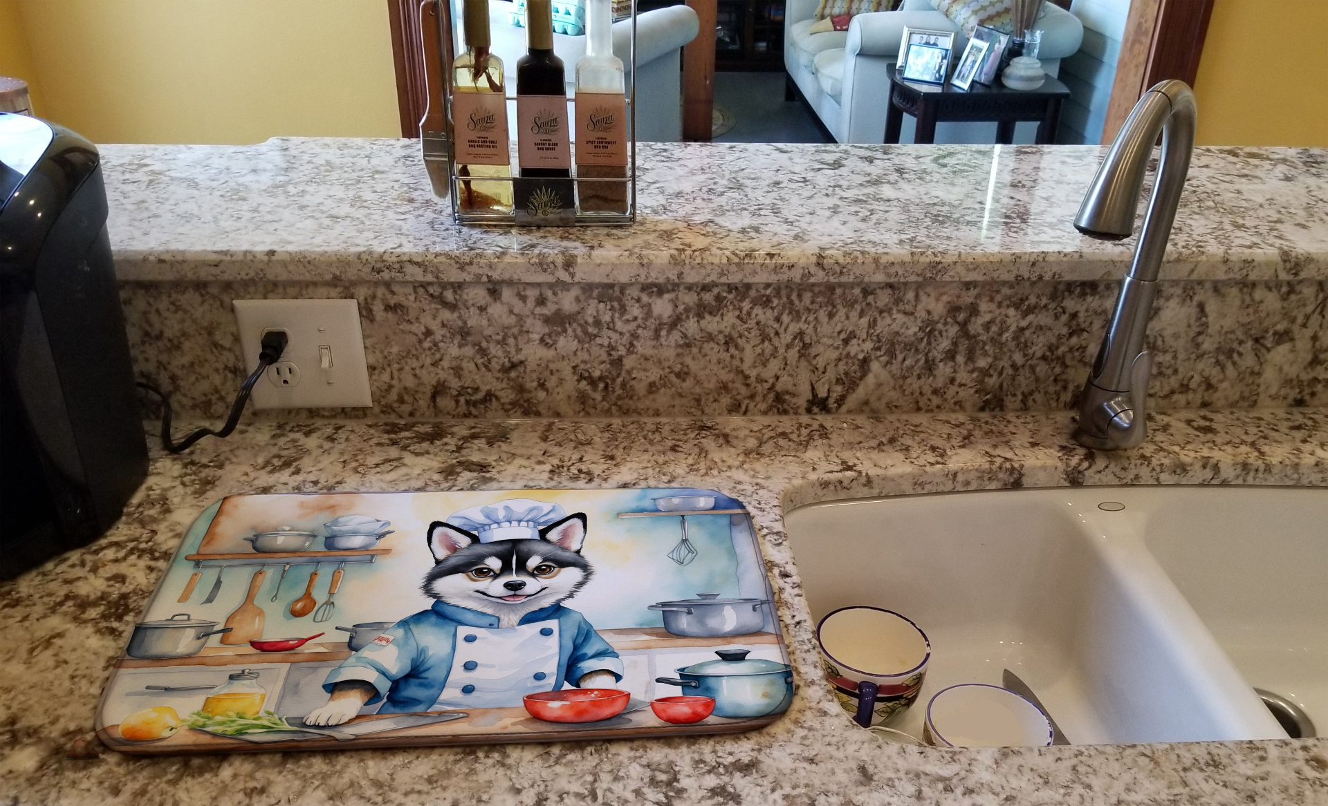 Dish Drying Mat featuring breed specific Alaskan Klee Kai artwork. Say goodbye to messy countertops and soggy dish towels with our innovative dish drying mat. Our high-quality dish drying pad is designed to keep your countertops dry while offering a stylish and efficient solution. Whether you're air drying dishes, glasses, stemware, silverware, pots, pans, bottles, or even fruits and vegetables, our dish mat is the perfect choice. The 14 inches x 22 inches size fits most counters and dish drying racks, and the non-slip design ensures stability. Made with water-absorbent polyester and a polyurethane foam insert, our dish drying mat is not only functional but also durable. It's machine washable and printed in the USA for long-lasting use. The beautiful artwork adds flair to your kitchen decor, making it a perfect housewarming gift or present for any occasion. Upgrade your kitchen experience with our absorbent and versatile dish drying mat.