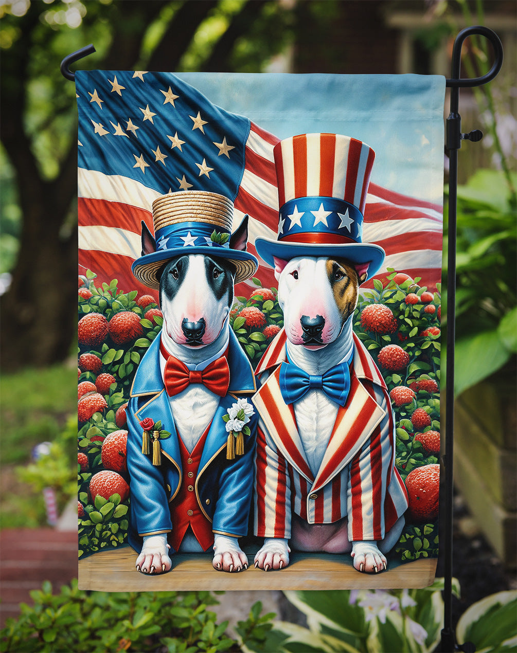 Garden Flag featuring breed specific Bull Terrier artwork. Enhance the beauty of your garden, patio, or yard with Caroline's Treasures Decorative Garden Flag, proudly made in the USA. Crafted from two pieces of thick, double-sided polyester fabric, this 2-ply garden flag is designed to withstand various weather conditions, making it water-resistant and weatherproof. Featuring correctly readable words on both sides, this garden flag offers a delightful visual experience from any angle. With its heavier weight, it stands out among other garden flags, ensuring stability and durability even in wind, rain, and snow. Measuring approximately 11 1/4 inches by 15 1/2 inches, this flag allows you to personalize your outdoor decor. It comes with a 1 1/2-inch sleeve sewn in, allowing easy attachment to any standard garden flag stand or garden size porch hanger (sold separately). Make a statement in your outdoor space with Caroline's Treasures Decorative Garden Flag, a vibrant and high-quality flag that adds color and personality to your surroundings. Proudly made in the USA, it's a symbol of quality craftsmanship and attention to detail.