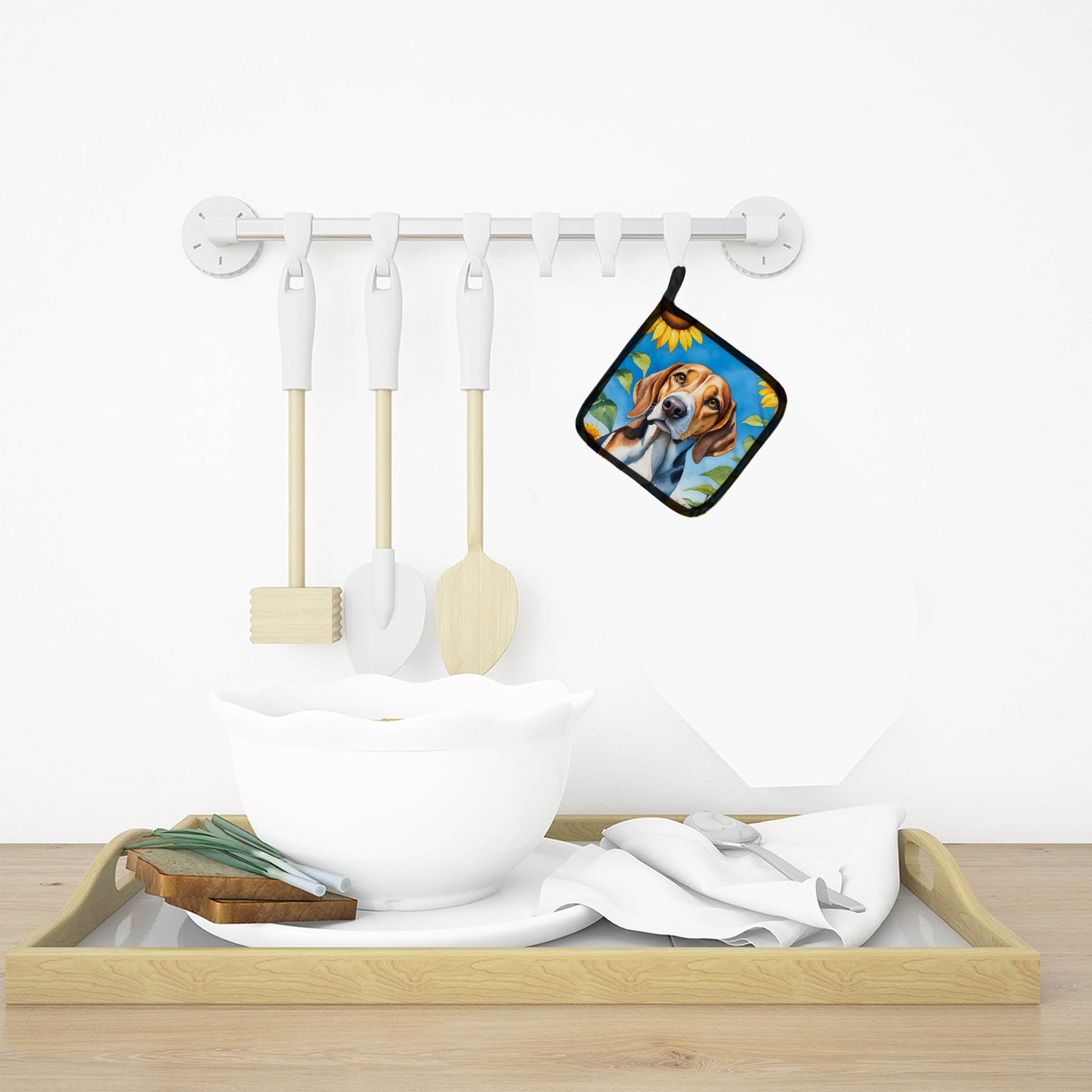 Pair of Pot Holders featuring breed specific American Foxhound artwork. A Pair of Pot Holders to match your kitchen decor. Made in the USA these are thick and functional. Full color artwork decorates the front polyester fabric of the hot pad and accented by a black trim. Use these at as a trivet for your Thanksgiving or Christmas tablescape. Filled with insulated fabric and quilted for durability. These colorful pot holders will make a great gift for your favorite home cook or executive chef. Each pot holder measures approximately 7 1/2 inches by 7 1/2 inches. A hanging tab is included.