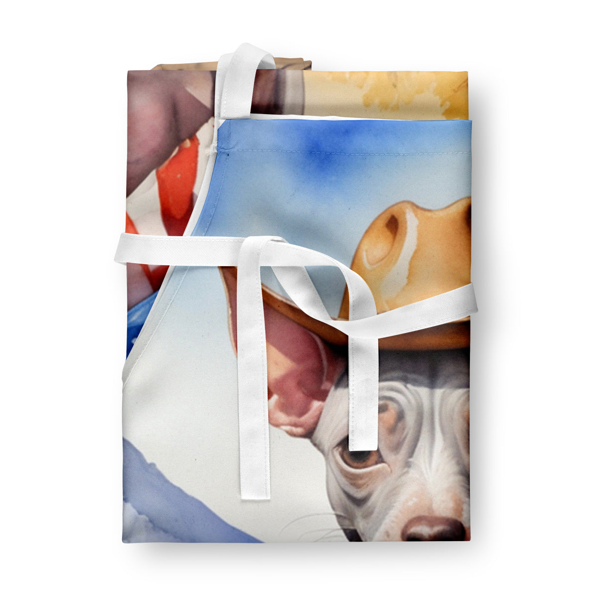 Apron featuring breed specific American Hairless Terrier artwork. Elevate your cooking, baking, and grilling experiences with our versatile Kitchen or BBQ Apron. This Bib Style apron isn't just limited to culinary activities - it also serves as an excellent baking apron, artist apron, server apron, gardening apron, or even a dog grooming apron. The apron showcases vibrant full-color artwork contributed by one of our talented artists, bringing a dash of style to your daily tasks. With dimensions of approximately 27"W x 30"H, it provides ample coverage to protect your clothing from spills and splashes. Our apron is meticulously crafted from 100% Ultra Spun Polyester, known for its durability and lightweight nature. The apron comes with white tie straps, ensuring a comfortable and adjustable fit for all. It's a perfect choice for kitchen apron enthusiasts, whether you are a woman or a man. Designed for easy maintenance, this apron is fully machine washable. The quick-drying polyester material actively reduces staining, keeping your apron looking fresh and new for longer. Our beautifully designed apron isn't just a functional kitchen accessory - it's a fashion statement in the culinary world!