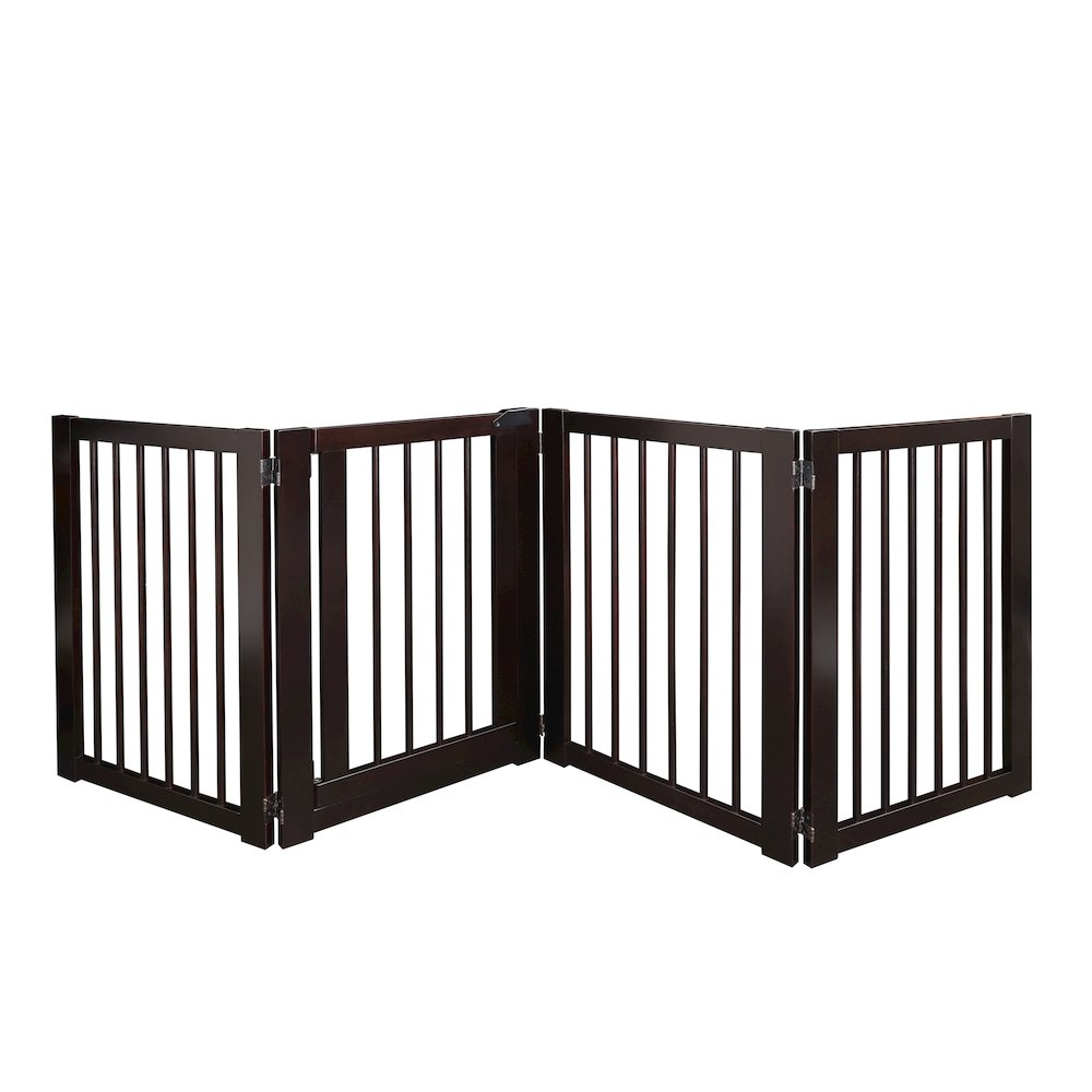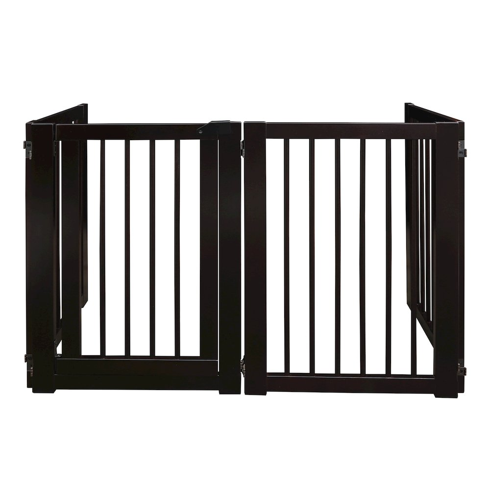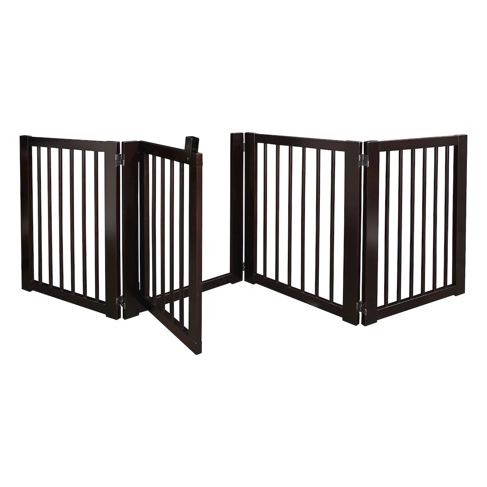 Keep your pets safe and sound with this Freestanding Pet Gate with 4 panels. Made from American Hardwood, the gate's beautiful espresso tone matches your home's woodwork. The panels can be arranged as a gate or a pen, so you can keep your pet in the area that suits your needs. Capable of spanning wide areas with ease (up to 72 inches). Chew-resistant wood provides peace of mind. The one stop solution to your pet gate needs. Folds easily for transport and storage.