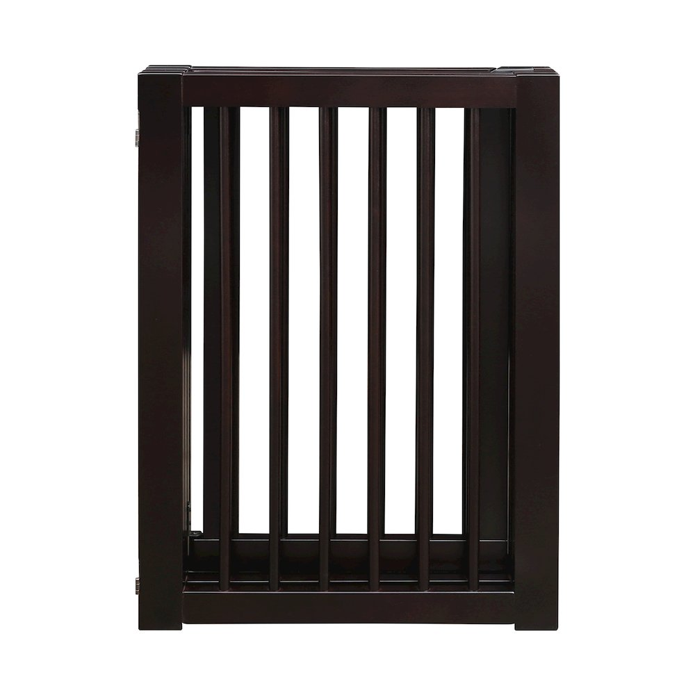 Product SummaryKeep your pets safe and sound with this free standing Pet gate with four panels. In a beautiful espresso tone, this gate matches your home's woodwork, so it won't stand out when it is used. The panels can be arranged as a gate or a pe Crafted from American Maple wood with a beautiful Espresso finishAllows you to customize your pets' spaceFolds down easily for storageNo assembly requiredOne door for easy entrance and exitDescriptionEasily set up an area for your pet with the