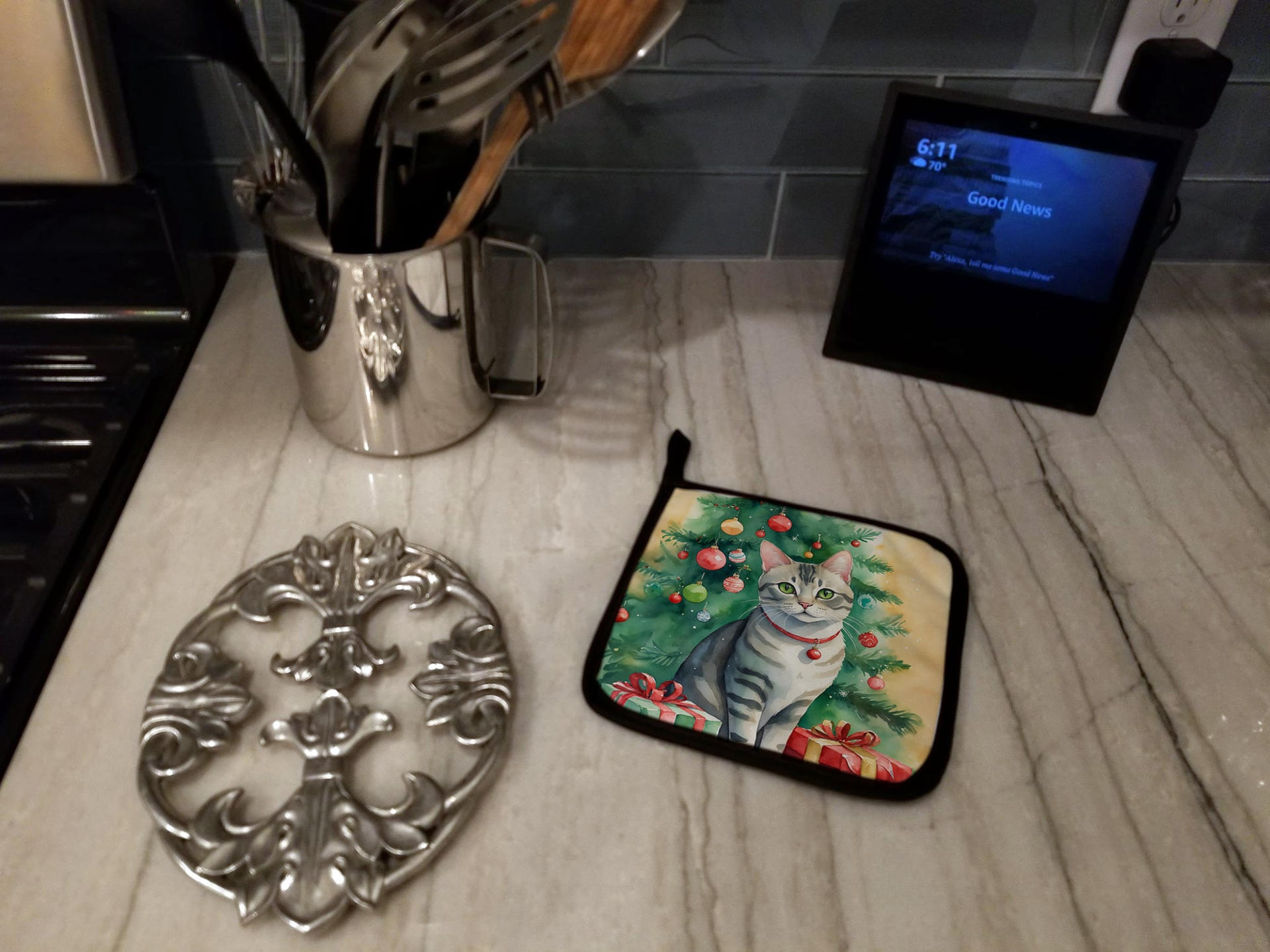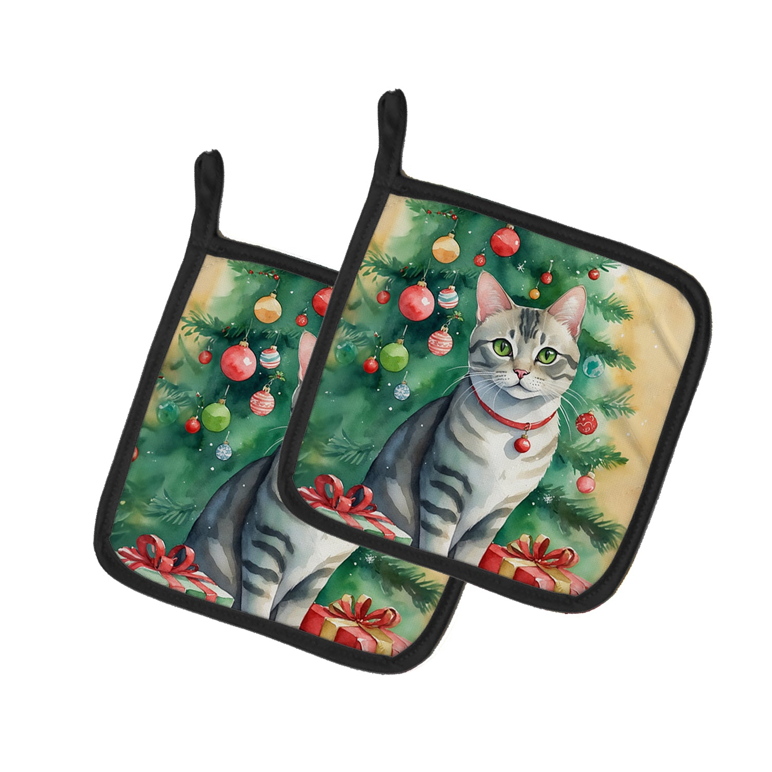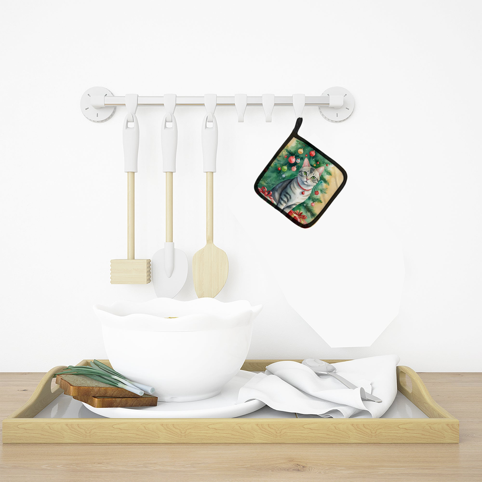 Asian Cat By the Christmas Tree Pair of Pot Holders