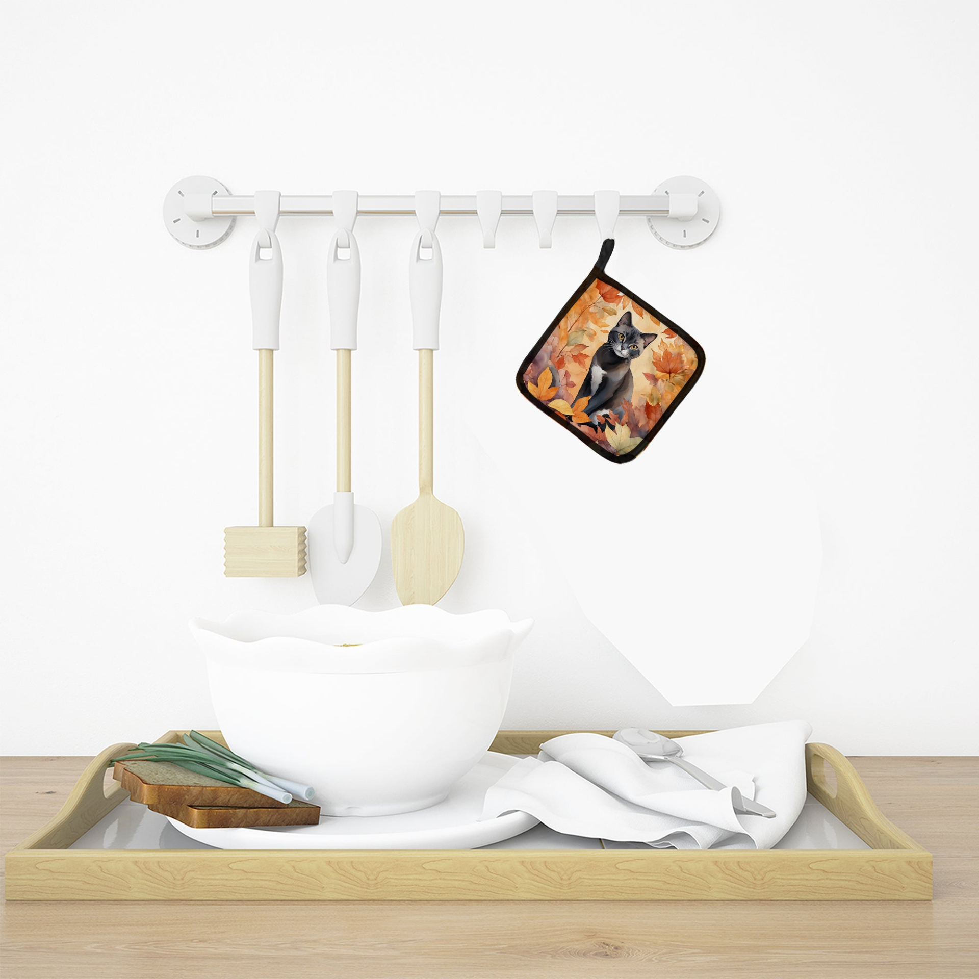 Pair of Pot Holders featuring breed specific Asian Cat artwork. A Pair of Pot Holders to match your kitchen decor. Made in the USA these are thick and functional. Full color artwork decorates the front polyester fabric of the hot pad and accented by a black trim. Use these at as a trivet for your Thanksgiving or Christmas tablescape. Filled with insulated fabric and quilted for durability. These colorful pot holders will make a great gift for your favorite home cook or executive chef. Each pot holder measures approximately 7 1/2 inches by 7 1/2 inches. A hanging tab is included.