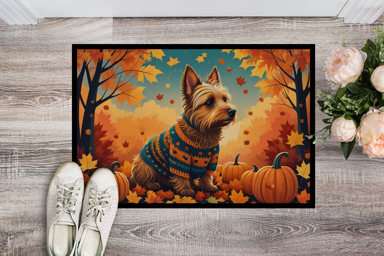 Doormat featuring breed specific Australian Terrier artwork. Welcome your guests in style with our Artwork Door Mat, designed to withstand almost any weather condition. This mat, measuring approximately 18 by 27 inches, is held together by durable black binding tape. Its top layer, composed of polyester felt, is dyed with the eye-catching image you see on the mat. A few layers below provide the mat with stability, while its rubber bottom is stamped to help prevent slipping and ensures safety. Our mat works wonderfully as both an indoor or outdoor door mat. For cleaning, simply hose it off with water or use a power washer - no need for any cleaner that produces suds. Avoid scrubbing with a brush, instead, opt for the vacuum on floor setting. Designed manufactured and printed in the USA, this mat is a perfect addition to your porch, outdoor kitchen, entryway, or any indoor space. Its unique design makes it a charming decorative rug that greets your guests and adds a stylish touch to your home decor.
