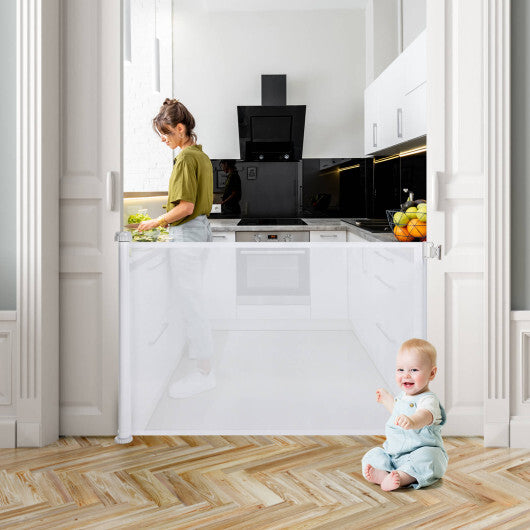 Specifications: Color: White Material: Aluminum fabric ABS Overall dimension: 55" x 33"(W x H) Dimension of mesh (Fully Expanded): 52" x 31.5" (W x H) Net weight: 4 lbs Applicable age: 6- 24 Months old Box Qty: 1(May vary by batch)Package includes: 1 x Retractable baby gate 1 x Instruction