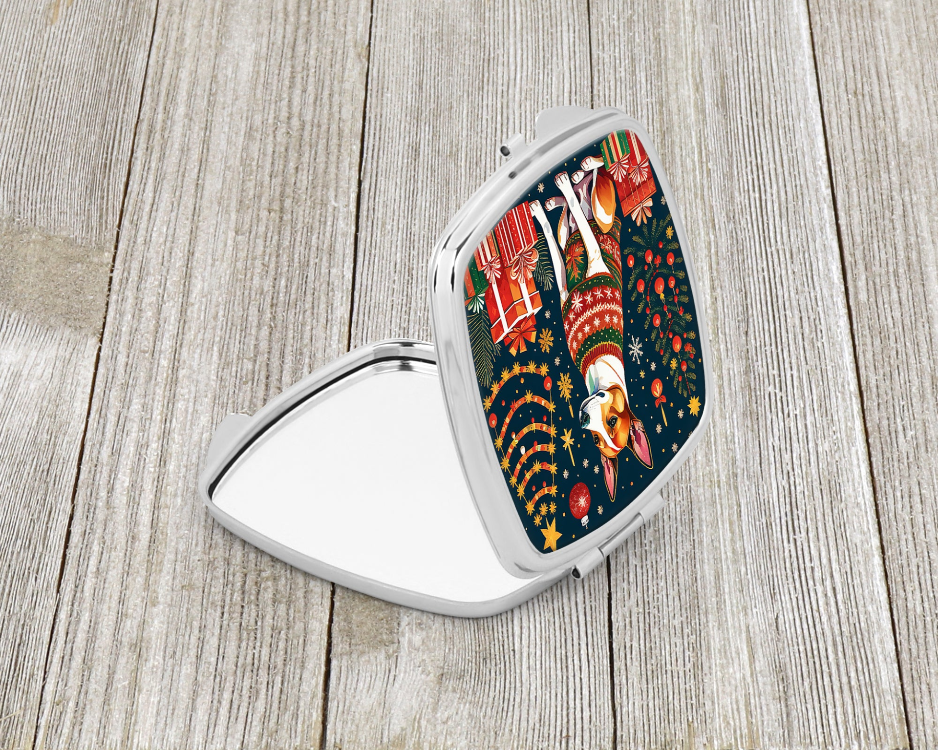 Compact Mirror featuring breed specific Basenji artwork. Celebrate Christmas with this Christmas Compact Mirror. Introducing our Square Compact Mirror, a blend of elegance, functionality, and compactness, perfect for on-the-go touch-ups. This Silvertone metal mirror, with dimensions of 2.75 inches x 3 inches x .3 inches, fits effortlessly into your purse, handbag, or pocket, ensuring that you can check your appearance anytime, anywhere. Our compact mirror stands out with its eye-catching artwork on the front, adding a dash of style to this practical accessory. It is more than just a mirror; it's a statement piece that reflects your personality and aesthetic. When opened, this compact reveals two mirrors inside, doubling your perspective for precise touch-ups. The Silvertone metal construction ensures durability while maintaining a lightweight feel, making it an ideal everyday carry item. Whether you're rushing to a meeting, prepping for a dinner date, or just need a quick check on your look, our Square Compact Mirror is your reliable companion. Experience the perfect blend of style and practicality with this must-have accessory.