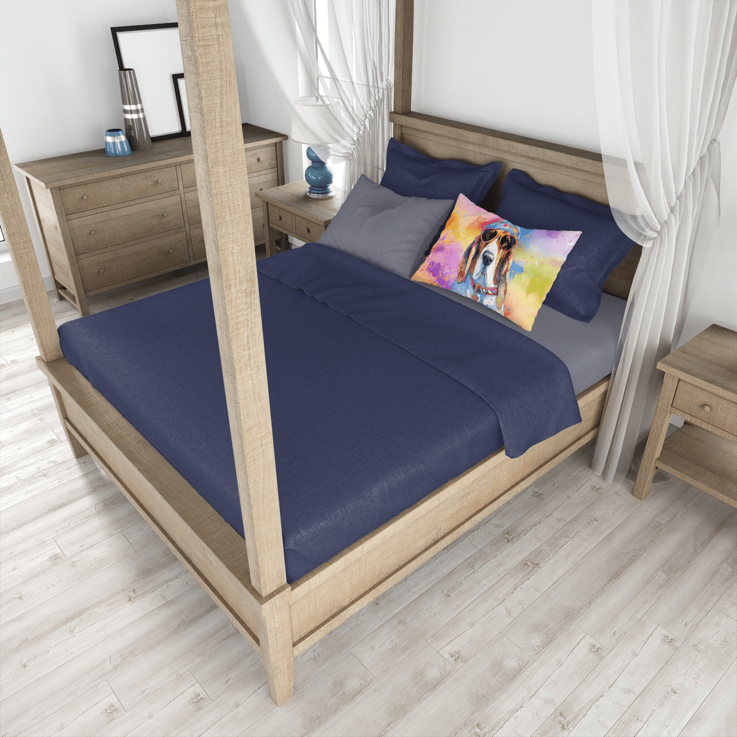 Standard Pillowcase featuring breed specific Basset Hound artwork. Experience an upgrade in your sleeping comfort with our Fabric Standard Pillowcase, designed to balance style, comfort, and practicality. Showcasing vibrant artwork on the front and a standard white on the back, this pillowcase is more than a functional item—it's an expression of your personal style. Crafted from premium moisture-wicking material, our pillowcase ensures a pleasant sleeping experience. The breathable performance fabric allows for excellent air circulation, keeping you cool and comfortable throughout the night while also demonstrating exceptional quality. This pillowcase, measuring 30 x 20.5 inches with a slender 0.15 inch thickness, and weighing only 0.25 lbs, fits a standard pillow perfectly. Maintaining our pillowcase is hassle-free. It requires no ironing—simply wash in cold water and dry at medium heat. Bring art and luxury into your bedroom with our Fabric Standard Pillowcase. Its unique design and top-tier fabric contribute to a relaxing and rejuvenating sleep experience. Brighten your bedroom decor while enhancing your sleep with our high-performance pillowcase.