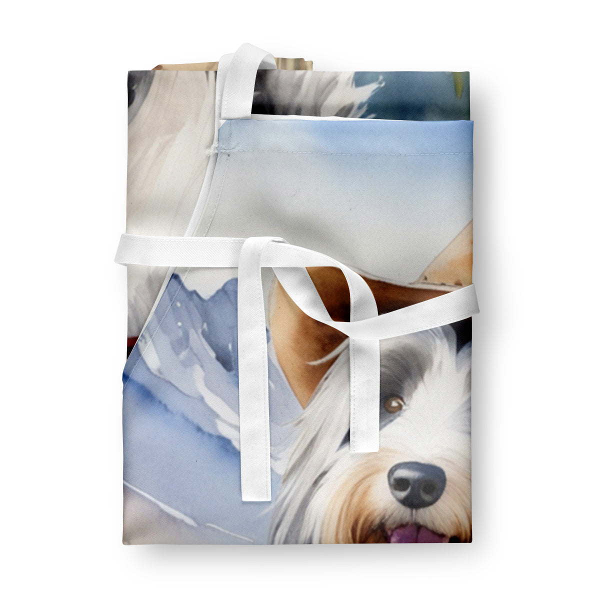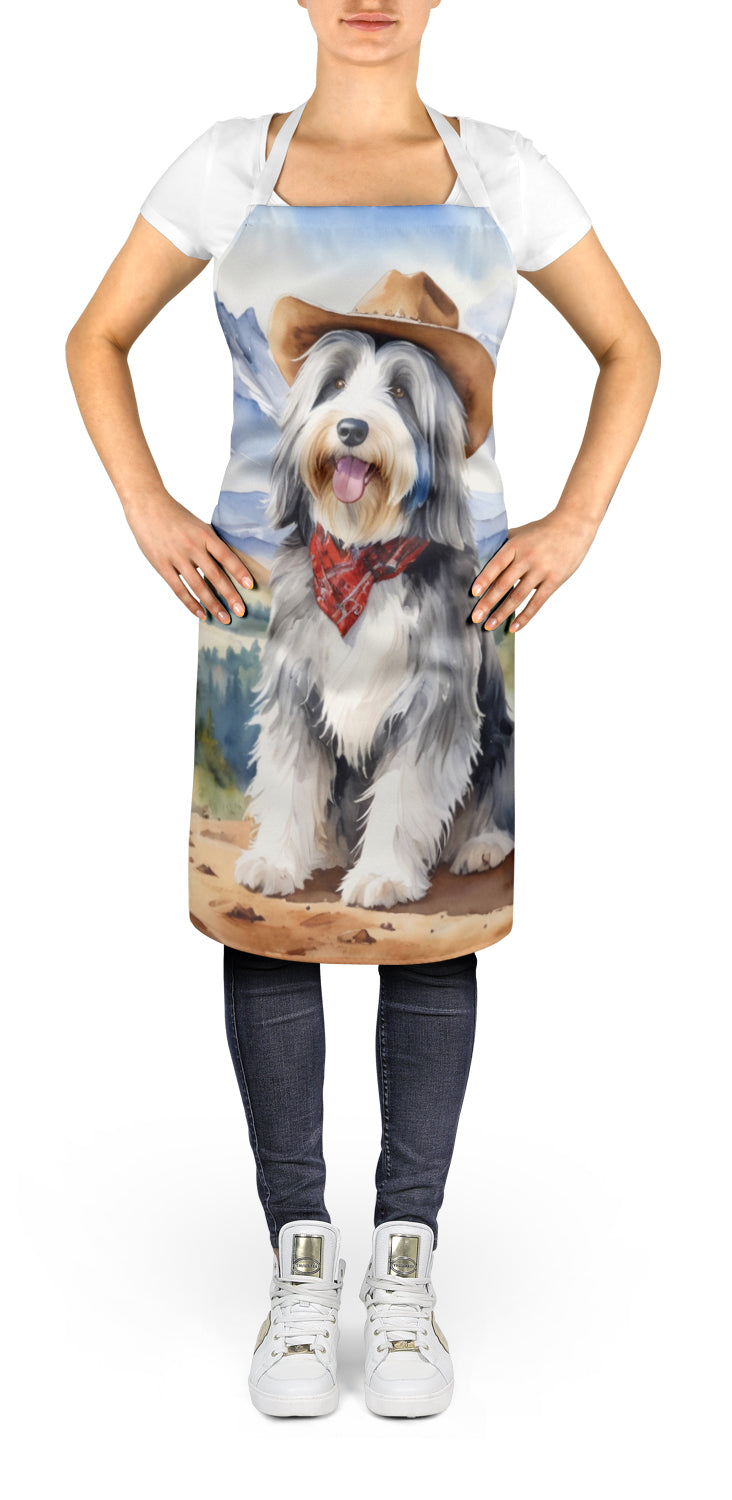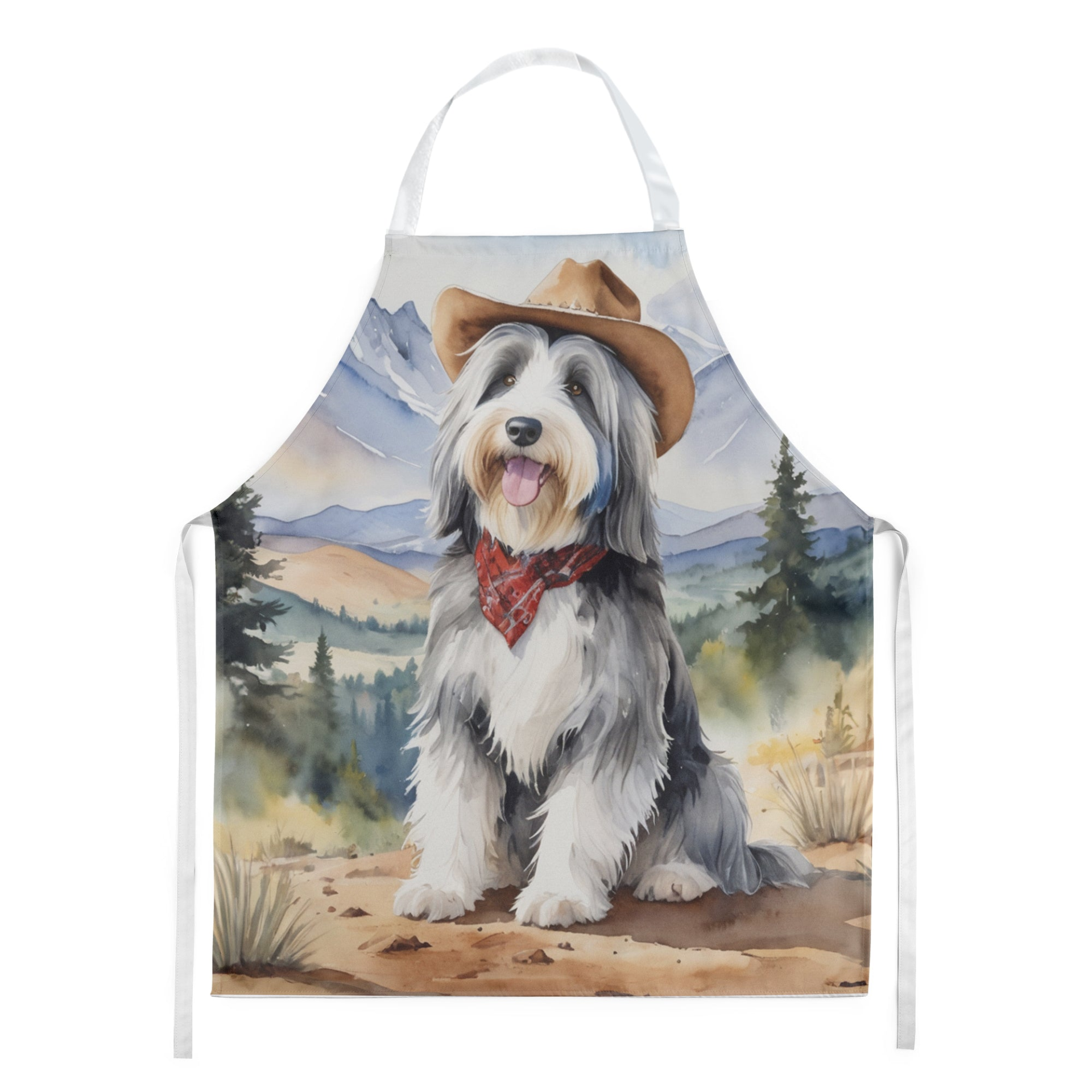 Apron featuring breed specific Bearded Collie artwork. Elevate your cooking, baking, and grilling experiences with our versatile Kitchen or BBQ Apron. This Bib Style apron isn't just limited to culinary activities - it also serves as an excellent baking apron, artist apron, server apron, gardening apron, or even a dog grooming apron. The apron showcases vibrant full-color artwork contributed by one of our talented artists, bringing a dash of style to your daily tasks. With dimensions of approximately 27"W x 30"H, it provides ample coverage to protect your clothing from spills and splashes. Our apron is meticulously crafted from 100% Ultra Spun Polyester, known for its durability and lightweight nature. The apron comes with white tie straps, ensuring a comfortable and adjustable fit for all. It's a perfect choice for kitchen apron enthusiasts, whether you are a woman or a man. Designed for easy maintenance, this apron is fully machine washable. The quick-drying polyester material actively reduces staining, keeping your apron looking fresh and new for longer. Our beautifully designed apron isn't just a functional kitchen accessory - it's a fashion statement in the culinary world!