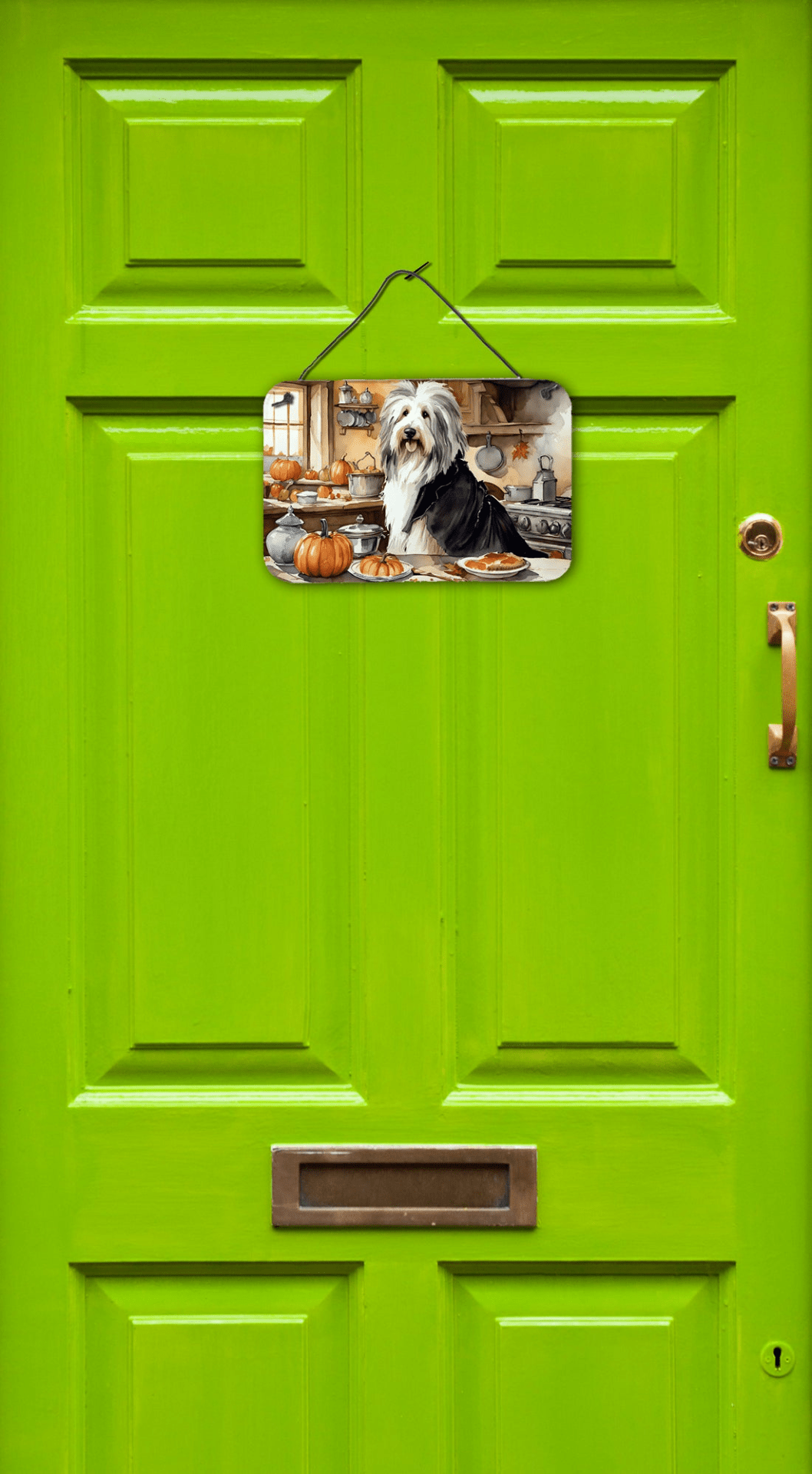 Celebrate Fall with a Bearded Collie wall hanging that blends breed charm with autumn vibes. This durable aluminum print adds a splash of color to kitchens, doors, patios, or offices, elevating everyday spaces with a touch of luxury. Designed with a lightweight profile, rounded corners, a black hanging rope, and a brushed silver back, it hangs easily and looks premium in any setting.