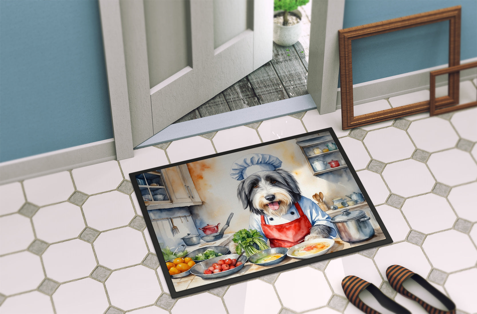 Doormat featuring breed specific Bearded Collie artwork. Welcome your guests in style with our Artwork Door Mat, designed to withstand almost any weather condition. This mat, measuring approximately 18 by 27 inches, is held together by durable black binding tape. Its top layer, composed of polyester felt, is dyed with the eye-catching image you see on the mat. A few layers below provide the mat with stability, while its rubber bottom is stamped to help prevent slipping and ensures safety. Our mat works wonderfully as both an indoor or outdoor door mat. For cleaning, simply hose it off with water or use a power washer - no need for any cleaner that produces suds. Avoid scrubbing with a brush, instead, opt for the vacuum on floor setting. Designed manufactured and printed in the USA, this mat is a perfect addition to your porch, outdoor kitchen, entryway, or any indoor space. Its unique design makes it a charming decorative rug that greets your guests and adds a stylish touch to your home decor.