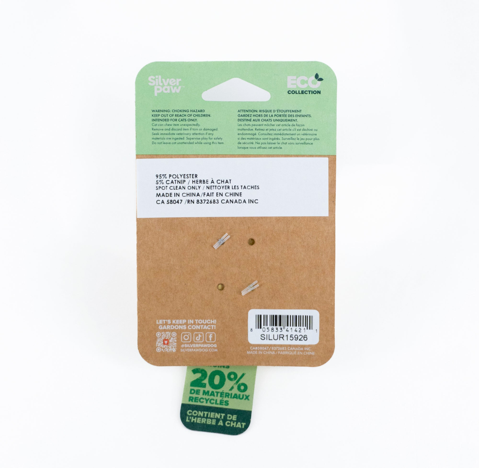 Crafted from recycled RPET plastic bottles and recycled cotton rope, this toy is both sustainable and sturdy. The built-in catnip stuffing makes it irresistible to cats, while the knotted rope legs are perfect for batting, tugging, and carrying. Reinforced seams ensure durability through every toss, pounce, and cuddle session.
