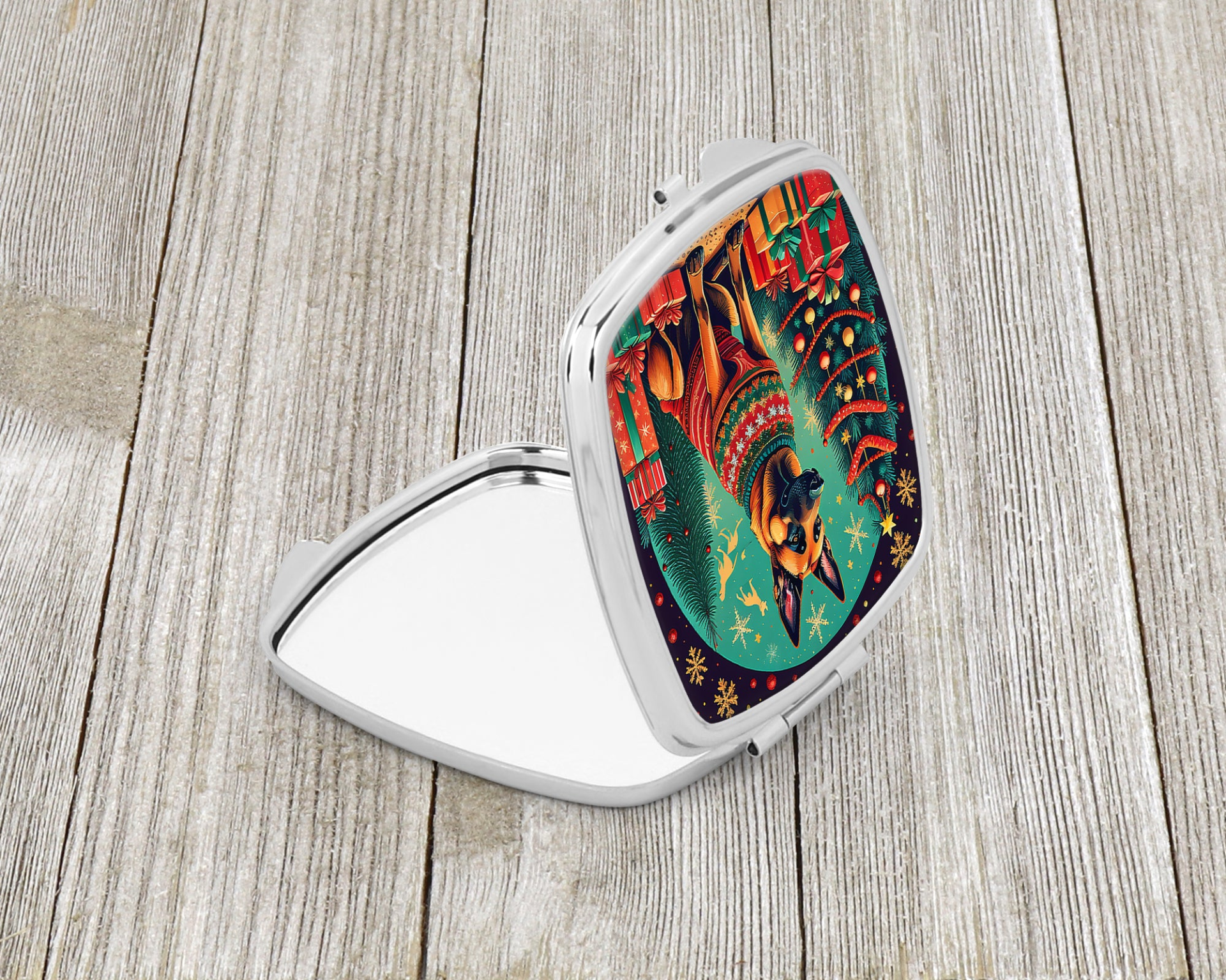 Compact Mirror featuring breed specific Belgian Malinois artwork. Celebrate Christmas with this Christmas Compact Mirror. Introducing our Square Compact Mirror, a blend of elegance, functionality, and compactness, perfect for on-the-go touch-ups. This Silvertone metal mirror, with dimensions of 2.75 inches x 3 inches x .3 inches, fits effortlessly into your purse, handbag, or pocket, ensuring that you can check your appearance anytime, anywhere. Our compact mirror stands out with its eye-catching artwork on the front, adding a dash of style to this practical accessory. It is more than just a mirror; it's a statement piece that reflects your personality and aesthetic. When opened, this compact reveals two mirrors inside, doubling your perspective for precise touch-ups. The Silvertone metal construction ensures durability while maintaining a lightweight feel, making it an ideal everyday carry item. Whether you're rushing to a meeting, prepping for a dinner date, or just need a quick check on your look, our Square Compact Mirror is your reliable companion. Experience the perfect blend of style and practicality with this must-have accessory.