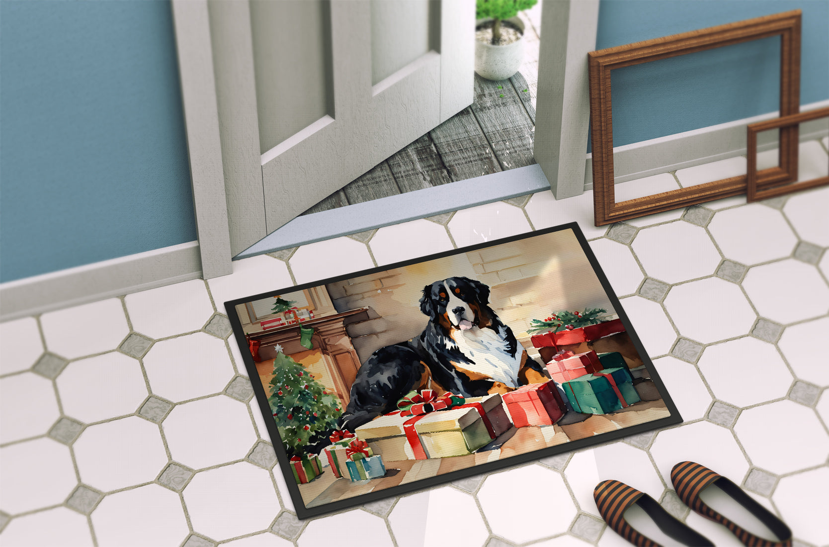 Doormat featuring breed specific Bernese Mountain Dog artwork. Celebrate Christmas with this Christmas Doormat. Welcome your guests in style with our Artwork Door Mat, designed to withstand almost any weather condition. This mat, measuring approximately 18 by 27 inches, is held together by durable black binding tape. Its top layer, composed of polyester felt, is dyed with the eye-catching image you see on the mat. A few layers below provide the mat with stability, while its rubber bottom is stamped to help prevent slipping and ensures safety. Our mat works wonderfully as both an indoor or outdoor door mat. For cleaning, simply hose it off with water or use a power washer - no need for any cleaner that produces suds. Avoid scrubbing with a brush, instead, opt for the vacuum on floor setting. Designed manufactured and printed in the USA, this mat is a perfect addition to your porch, outdoor kitchen, entryway, or any indoor space. Its unique design makes it a charming decorative rug that greets your guests and adds a stylish touch to your home decor.