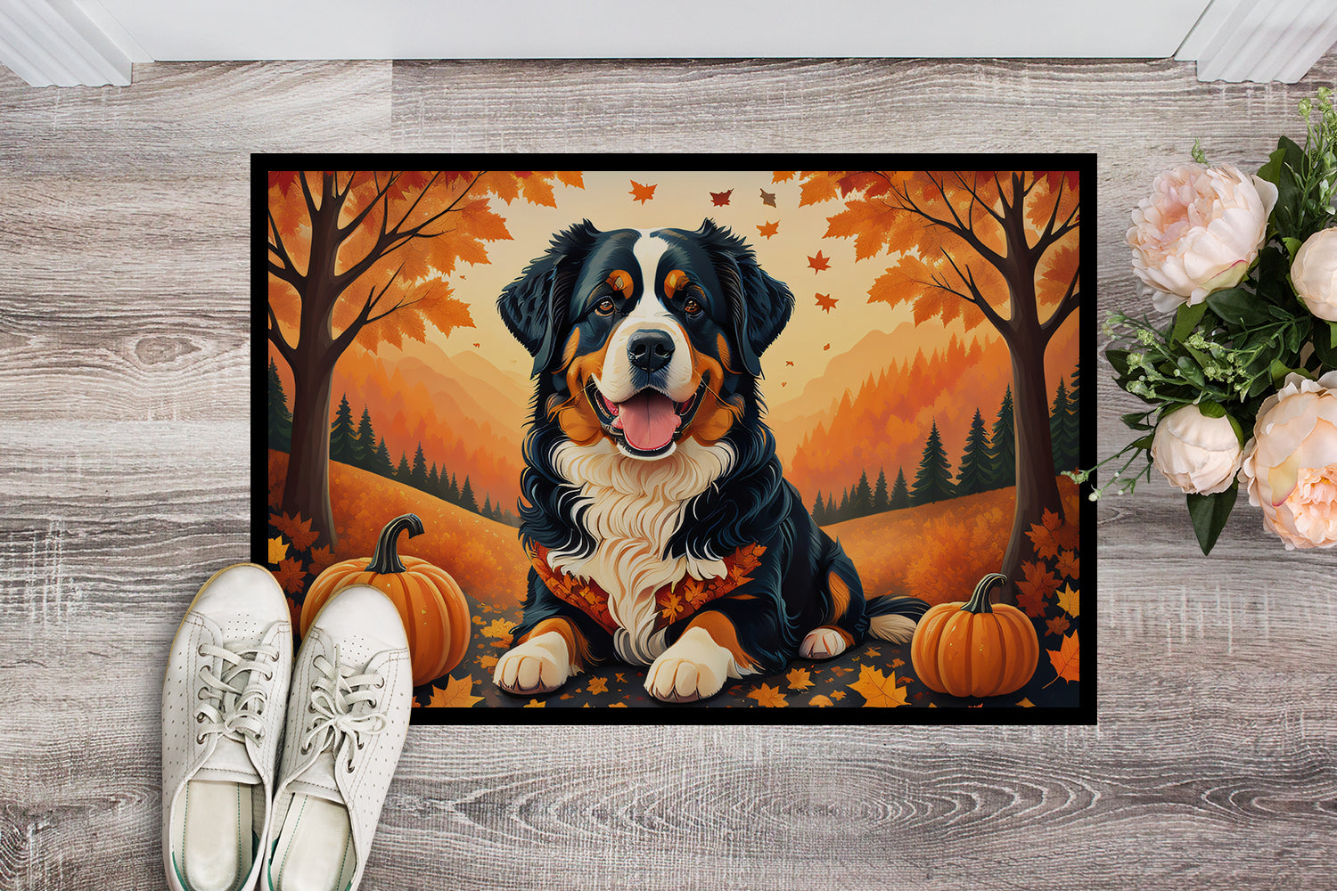 Doormat featuring breed specific Bernese Mountain Dog artwork. Welcome your guests in style with our Artwork Door Mat, designed to withstand almost any weather condition. This mat, measuring approximately 24 by 36 inches, is held together by durable black binding tape. Its top layer, composed of polyester felt, is dyed with the eye-catching image you see on the mat. A few layers below provide the mat with stability, while its rubber bottom is stamped to help prevent slipping and ensures safety. Our mat works wonderfully as both an indoor or outdoor door mat. For cleaning, simply hose it off with water or use a power washer - no need for any cleaner that produces suds. Avoid scrubbing with a brush, instead, opt for the vacuum on floor setting. Designed manufactured and printed in the USA, this mat is a perfect addition to your porch, outdoor kitchen, entryway, or any indoor space. Its unique design makes it a charming decorative rug that greets your guests and adds a stylish touch to your home decor.