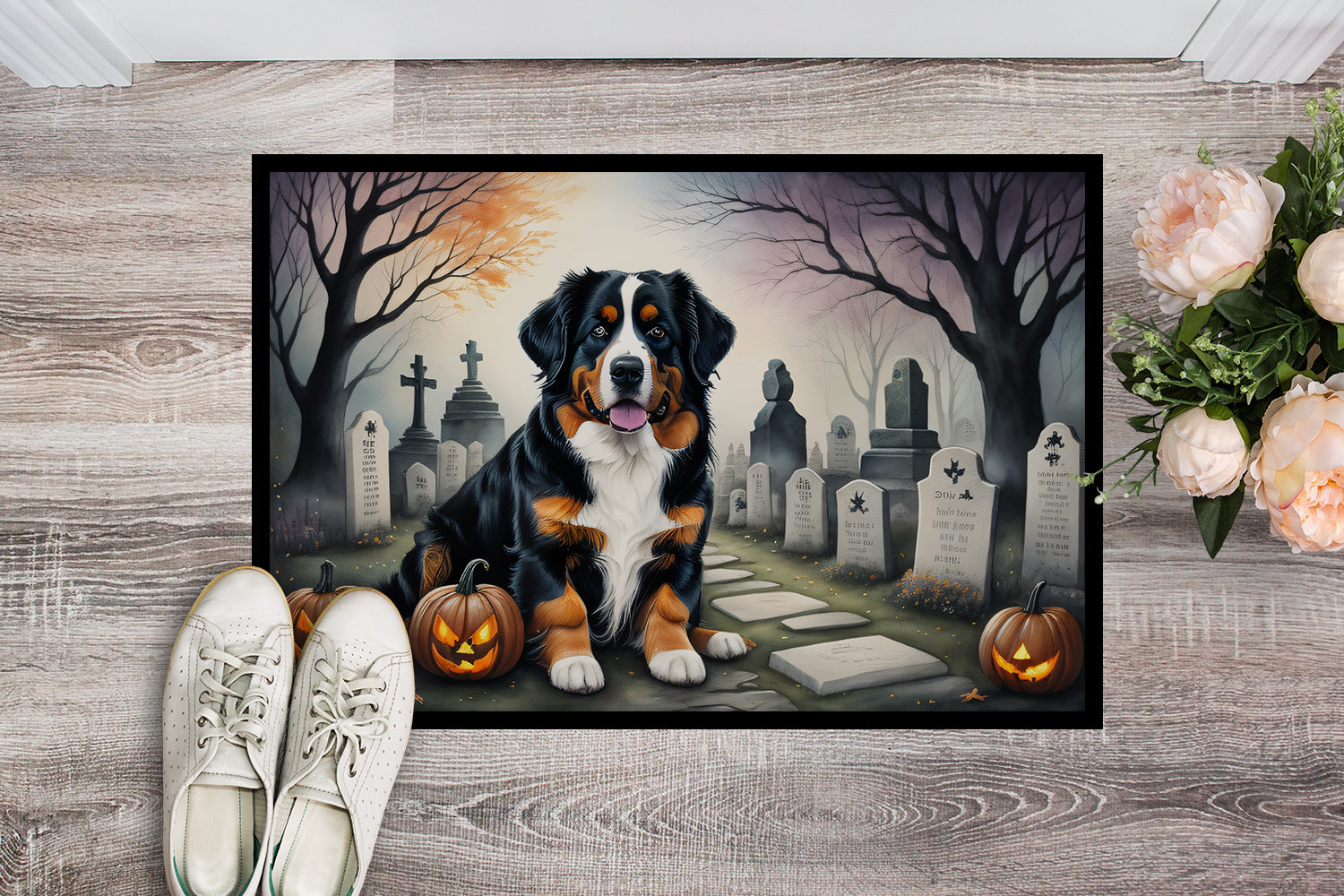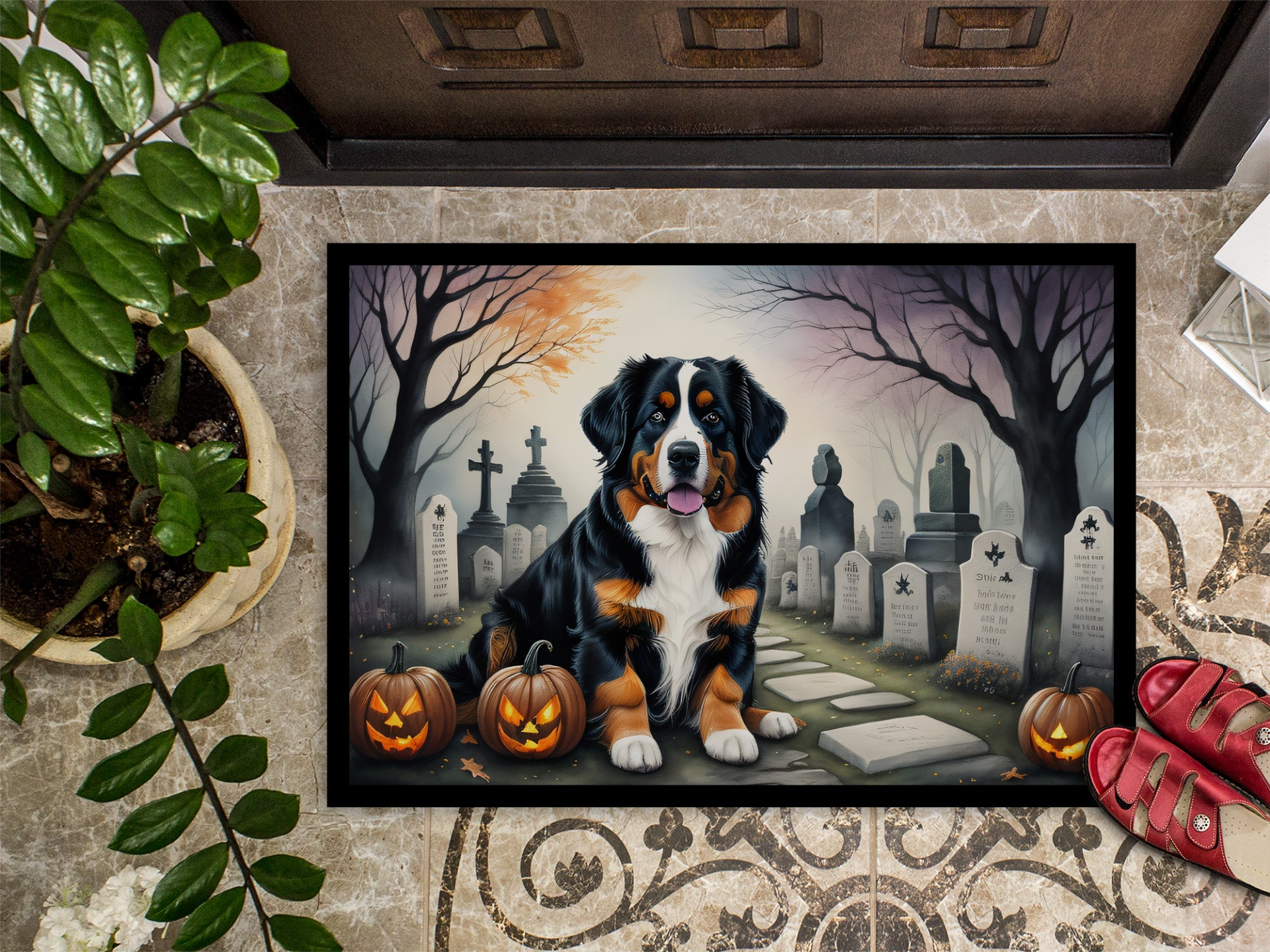 Doormat featuring breed specific Bernese Mountain Dog artwork. Celebrate Halloween with this Halloween Doormat. Welcome your guests in style with our Artwork Door Mat, designed to withstand almost any weather condition. This mat, measuring approximately 18 by 27 inches, is held together by durable black binding tape. Its top layer, composed of polyester felt, is dyed with the eye-catching image you see on the mat. A few layers below provide the mat with stability, while its rubber bottom is stamped to help prevent slipping and ensures safety. Our mat works wonderfully as both an indoor or outdoor door mat. For cleaning, simply hose it off with water or use a power washer - no need for any cleaner that produces suds. Avoid scrubbing with a brush, instead, opt for the vacuum on floor setting. Designed manufactured and printed in the USA, this mat is a perfect addition to your porch, outdoor kitchen, entryway, or any indoor space. Its unique design makes it a charming decorative rug that greets your guests and adds a stylish touch to your home decor.