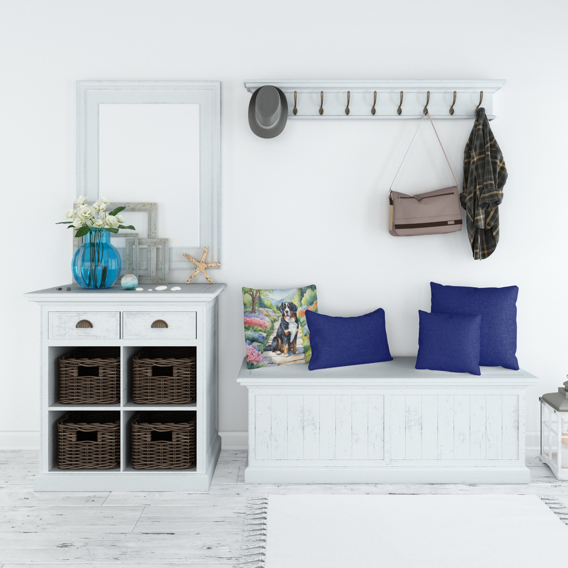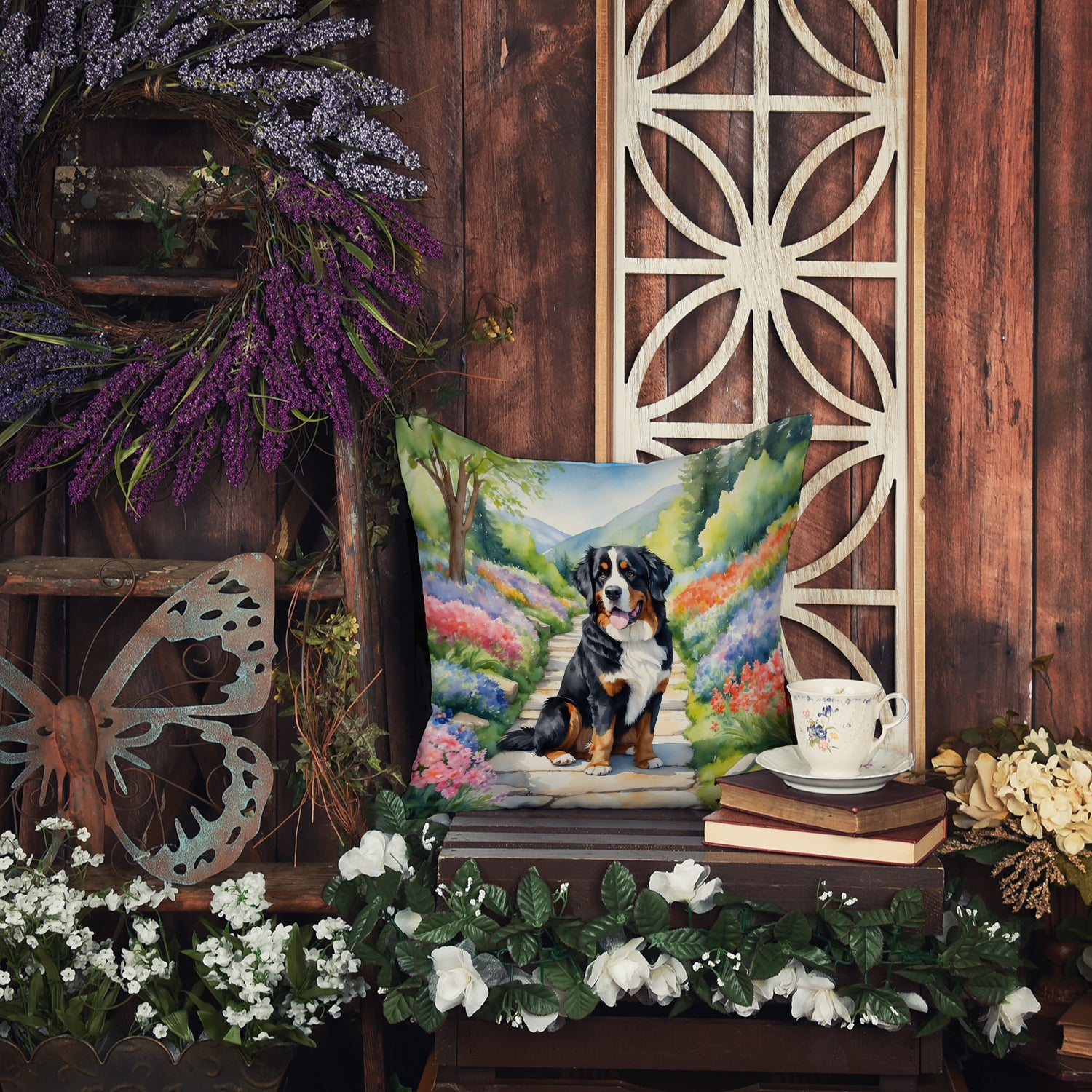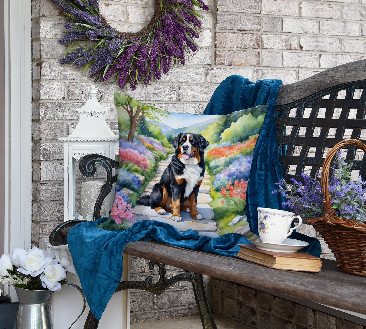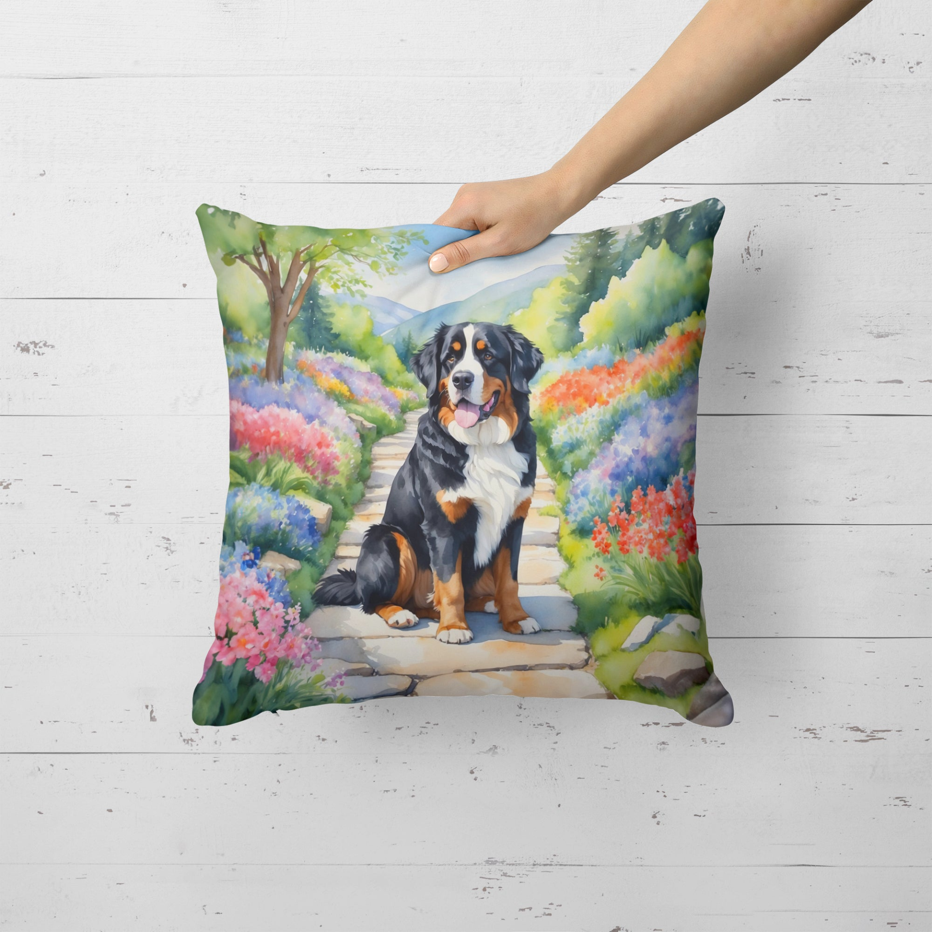 Throw Pillow featuring breed specific Bernese Mountain Dog artwork. Revitalize your outdoor or indoor living space with Caroline's Treasures 18x18 Fabric Decorative Pillow. With a generously sized dimension of approximately 18 inches by 18 inches, this pillow makes a comfortable and aesthetic addition to any seating area. Made from a unique, water-resistant material developed by Caroline's Treasures, the pillow sham is 100% polyester fabric that's durable and ready to weather any condition. Its vibrant, full-color artwork will not fade over time as it is dyed with color-fast dyes. Whether you place it on your patio furniture, porch, veranda, or indoor couch, its soft canvas fabric ensures a cozy experience. The pillow is handcrafted in the United States, featuring a sham created from three pieces of fabric and a polyester insert for enduring shape and overstuffed comfort. Despite being robustly built to endure the outdoors, it is as soft and snug as your favorite indoor cushions. Please note, as all our pillows are handmade, sizes may vary slightly, adding to the charm of this unique decorative item.