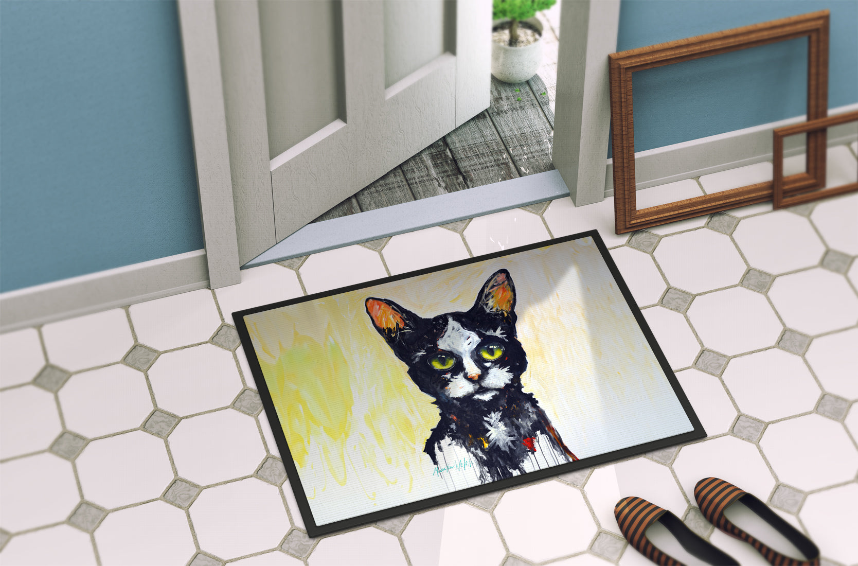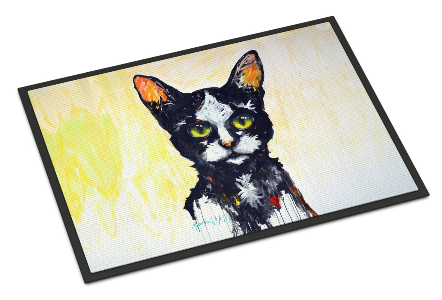 Welcome your guests in style with our Artwork Door Mat, designed to withstand almost any weather condition. This mat, measuring approximately 24 by 36 inches, is held together by durable black binding tape. Its top layer, composed of polyester felt, is dyed with the eye-catching image you see on the mat. A few layers below provide the mat with stability, while its rubber bottom is stamped to help prevent slipping and ensures safety. Our mat works wonderfully as both an indoor or outdoor door mat. For cleaning, simply hose it off with water or use a power washer - no need for any cleaner that produces suds. Avoid scrubbing with a brush, instead, opt for the vacuum on floor setting. Designed manufactured and printed in the USA, this mat is a perfect addition to your porch, outdoor kitchen, entryway, or any indoor space. Its unique design makes it a charming decorative rug that greets your guests and adds a stylish touch to your home decor.