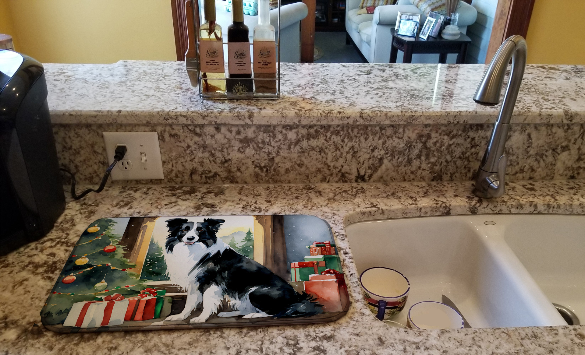 Dish Drying Mat featuring breed specific Border Collie artwork. Celebrate Christmas with this Christmas Dish Drying Mat. Say goodbye to messy countertops and soggy dish towels with our innovative dish drying mat. Our high-quality dish drying pad is designed to keep your countertops dry while offering a stylish and efficient solution. Whether you're air drying dishes, glasses, stemware, silverware, pots, pans, bottles, or even fruits and vegetables, our dish mat is the perfect choice. The 14 inches x 22 inches size fits most counters and dish drying racks, and the non-slip design ensures stability. Made with water-absorbent polyester and a polyurethane foam insert, our dish drying mat is not only functional but also durable. It's machine washable and printed in the USA for long-lasting use. The beautiful artwork adds flair to your kitchen decor, making it a perfect housewarming gift or present for any occasion. Upgrade your kitchen experience with our absorbent and versatile dish drying mat.