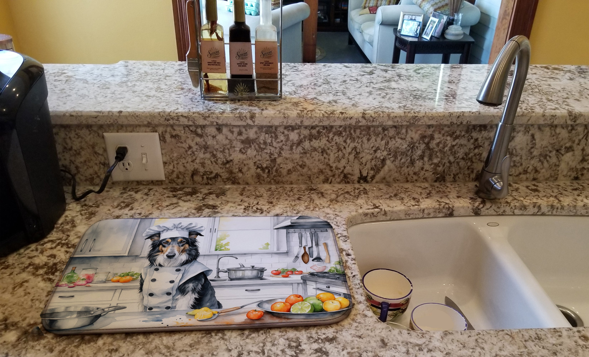Dish Drying Mat featuring breed specific Borzoi Russian Wolfhound artwork. Say goodbye to messy countertops and soggy dish towels with our innovative dish drying mat. Our high-quality dish drying pad is designed to keep your countertops dry while offering a stylish and efficient solution. Whether you're air drying dishes, glasses, stemware, silverware, pots, pans, bottles, or even fruits and vegetables, our dish mat is the perfect choice. The 14 inches x 22 inches size fits most counters and dish drying racks, and the non-slip design ensures stability. Made with water-absorbent polyester and a polyurethane foam insert, our dish drying mat is not only functional but also durable. It's machine washable and printed in the USA for long-lasting use. The beautiful artwork adds flair to your kitchen decor, making it a perfect housewarming gift or present for any occasion. Upgrade your kitchen experience with our absorbent and versatile dish drying mat.