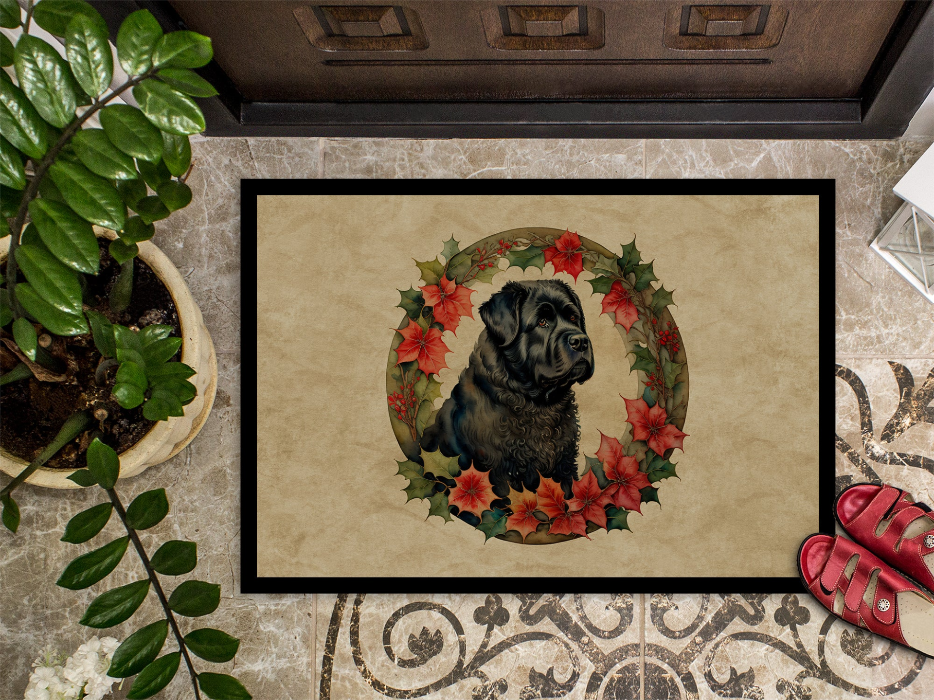 Doormat featuring breed specific Bouvier des Flandres artwork. Celebrate Christmas with this Christmas Doormat. Welcome your guests in style with our Artwork Door Mat, designed to withstand almost any weather condition. This mat, measuring approximately 24 by 36 inches, is held together by durable black binding tape. Its top layer, composed of polyester felt, is dyed with the eye-catching image you see on the mat. A few layers below provide the mat with stability, while its rubber bottom is stamped to help prevent slipping and ensures safety. Our mat works wonderfully as both an indoor or outdoor door mat. For cleaning, simply hose it off with water or use a power washer - no need for any cleaner that produces suds. Avoid scrubbing with a brush, instead, opt for the vacuum on floor setting. Designed manufactured and printed in the USA, this mat is a perfect addition to your porch, outdoor kitchen, entryway, or any indoor space. Its unique design makes it a charming decorative rug that greets your guests and adds a stylish touch to your home decor.