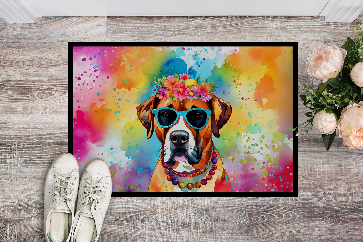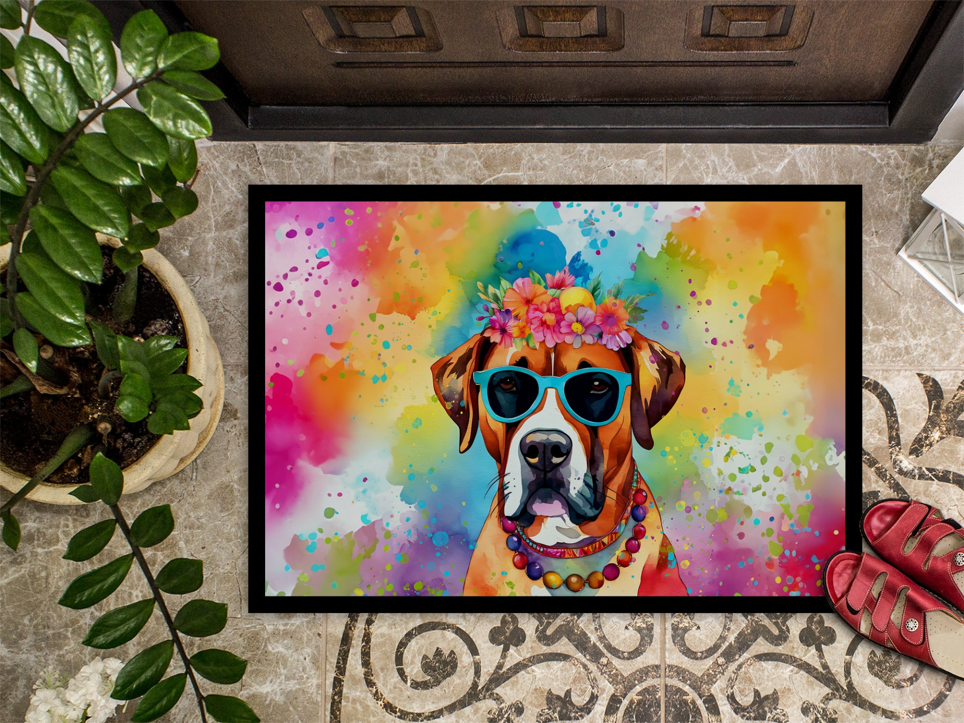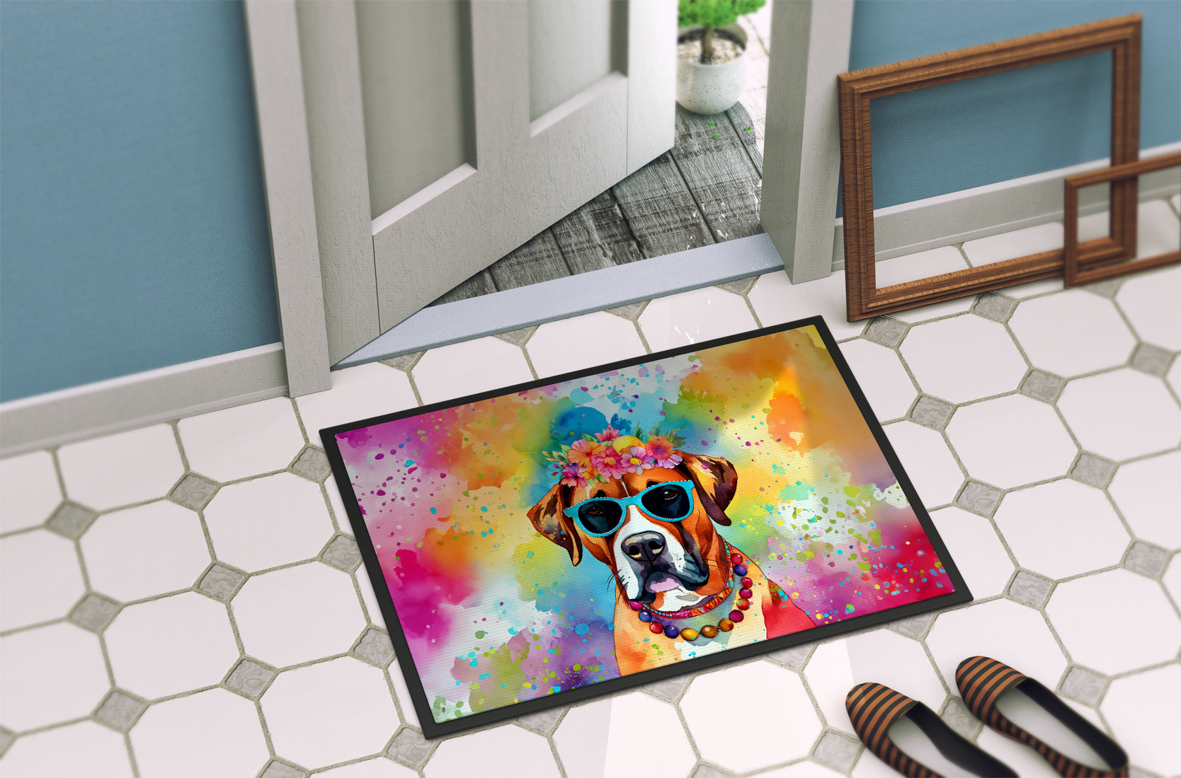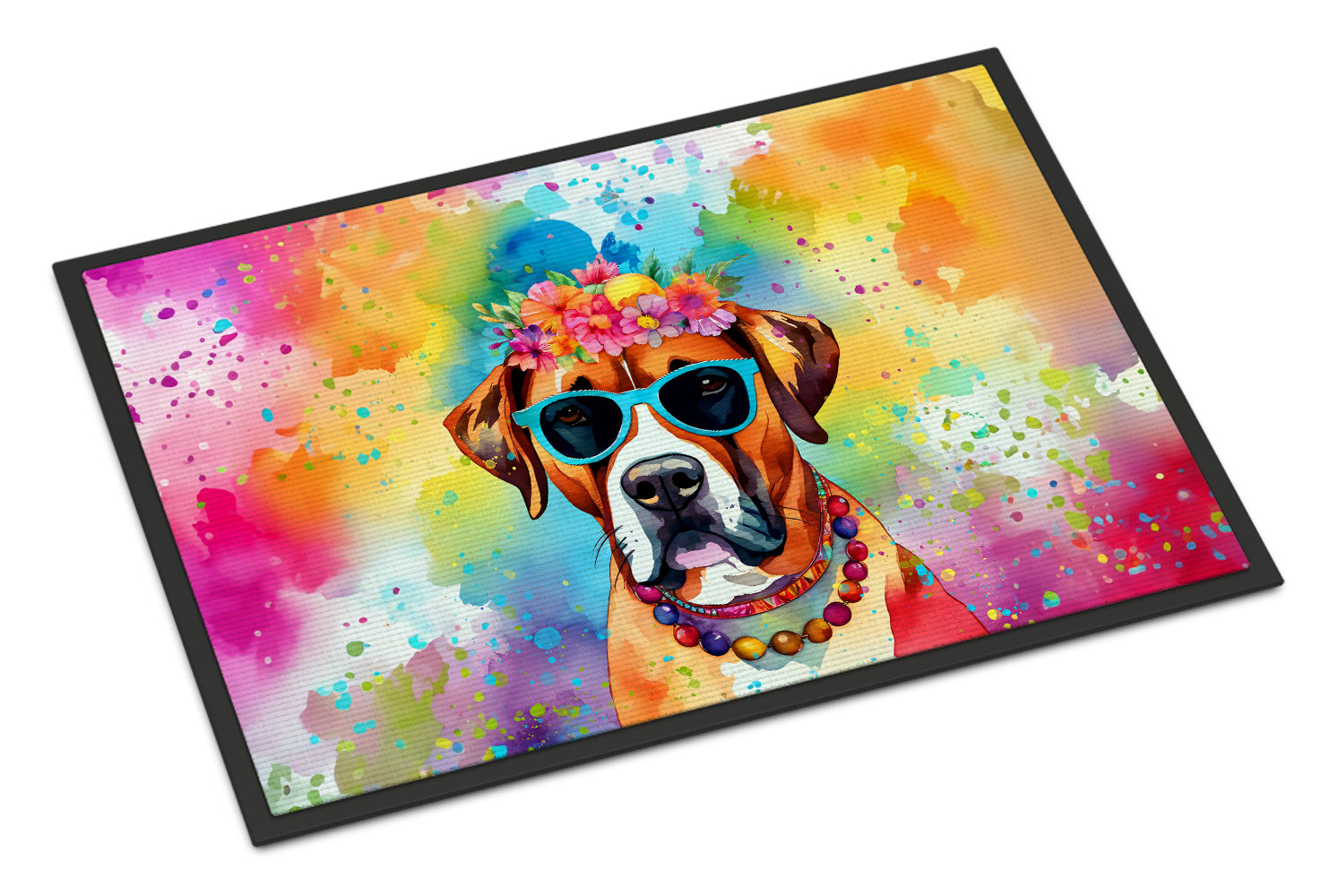 Doormat featuring breed specific Boxer artwork. Welcome your guests in style with our Artwork Door Mat, designed to withstand almost any weather condition. This mat, measuring approximately 18 by 27 inches, is held together by durable black binding tape. Its top layer, composed of polyester felt, is dyed with the eye-catching image you see on the mat. A few layers below provide the mat with stability, while its rubber bottom is stamped to help prevent slipping and ensures safety. Our mat works wonderfully as both an indoor or outdoor door mat. For cleaning, simply hose it off with water or use a power washer - no need for any cleaner that produces suds. Avoid scrubbing with a brush, instead, opt for the vacuum on floor setting. Designed manufactured and printed in the USA, this mat is a perfect addition to your porch, outdoor kitchen, entryway, or any indoor space. Its unique design makes it a charming decorative rug that greets your guests and adds a stylish touch to your home decor.