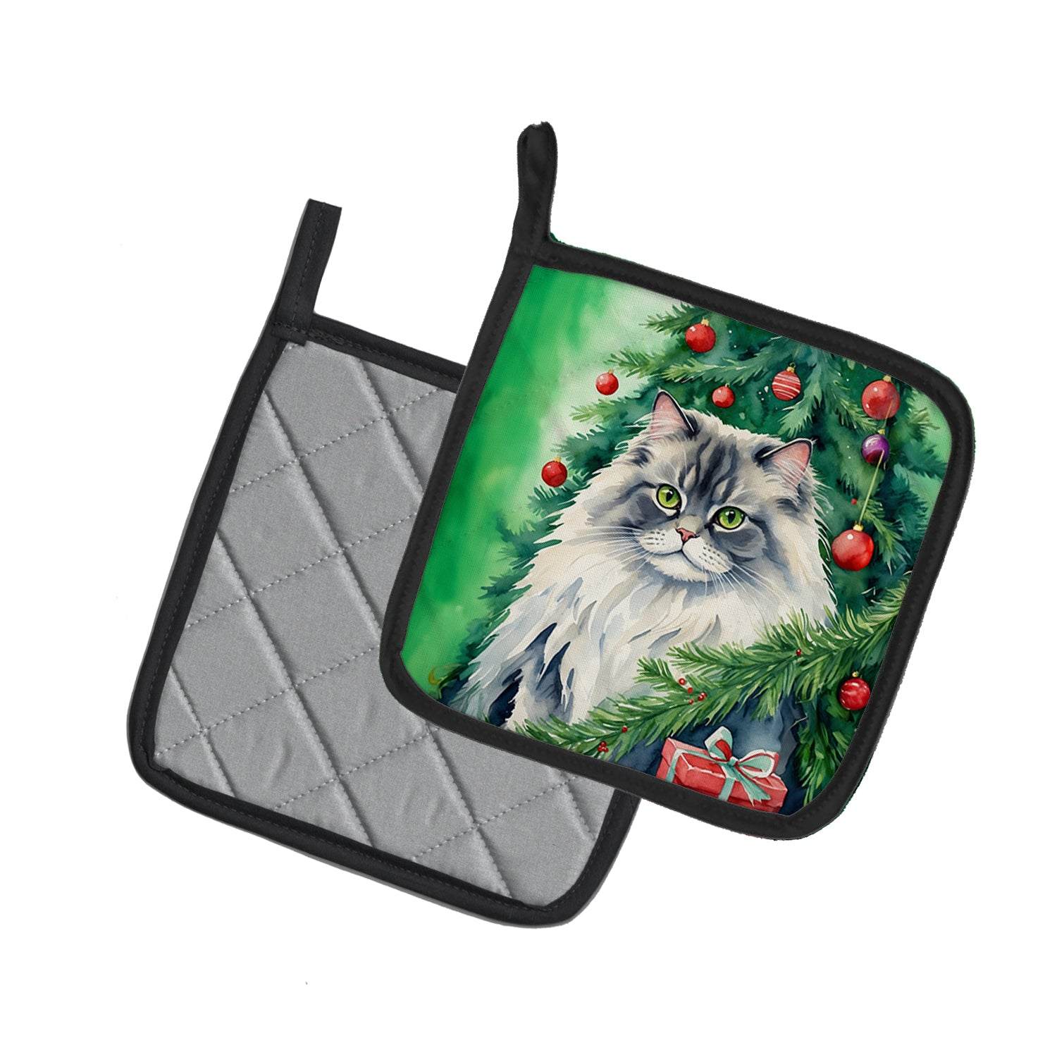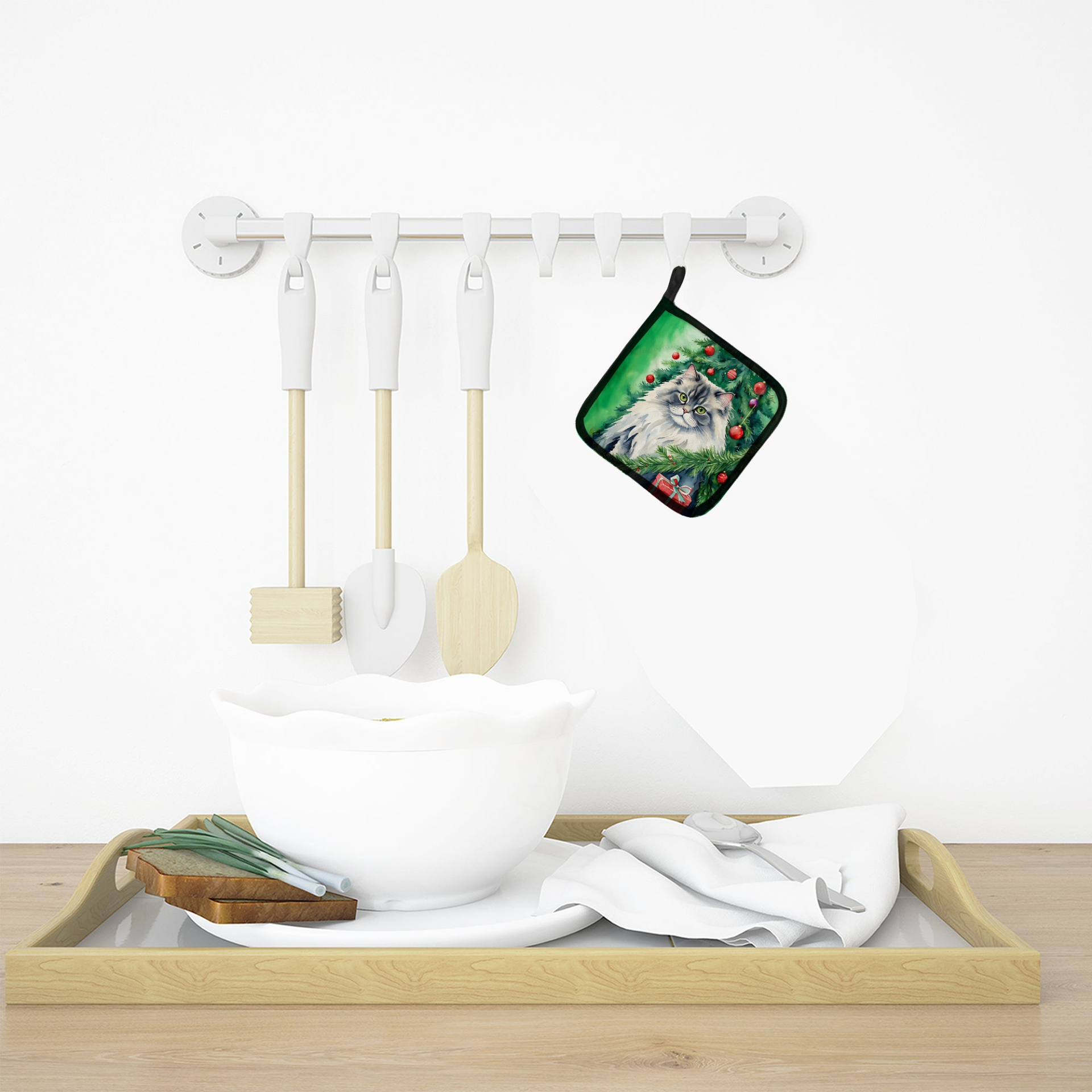 Pair of Pot Holders featuring breed specific British Longhair artwork. Celebrate Christmas with this Christmas Pair of Pot Holders. A Pair of Pot Holders to match your kitchen decor. Made in the USA these are thick and functional. Full color artwork decorates the front polyester fabric of the hot pad and accented by a black trim. Use these at as a trivet for your Thanksgiving or Christmas tablescape. Filled with insulated fabric and quilted for durability. These colorful pot holders will make a great gift for your favorite home cook or executive chef. Each pot holder measures approximately 7 1/2 inches by 7 1/2 inches. A hanging tab is included.