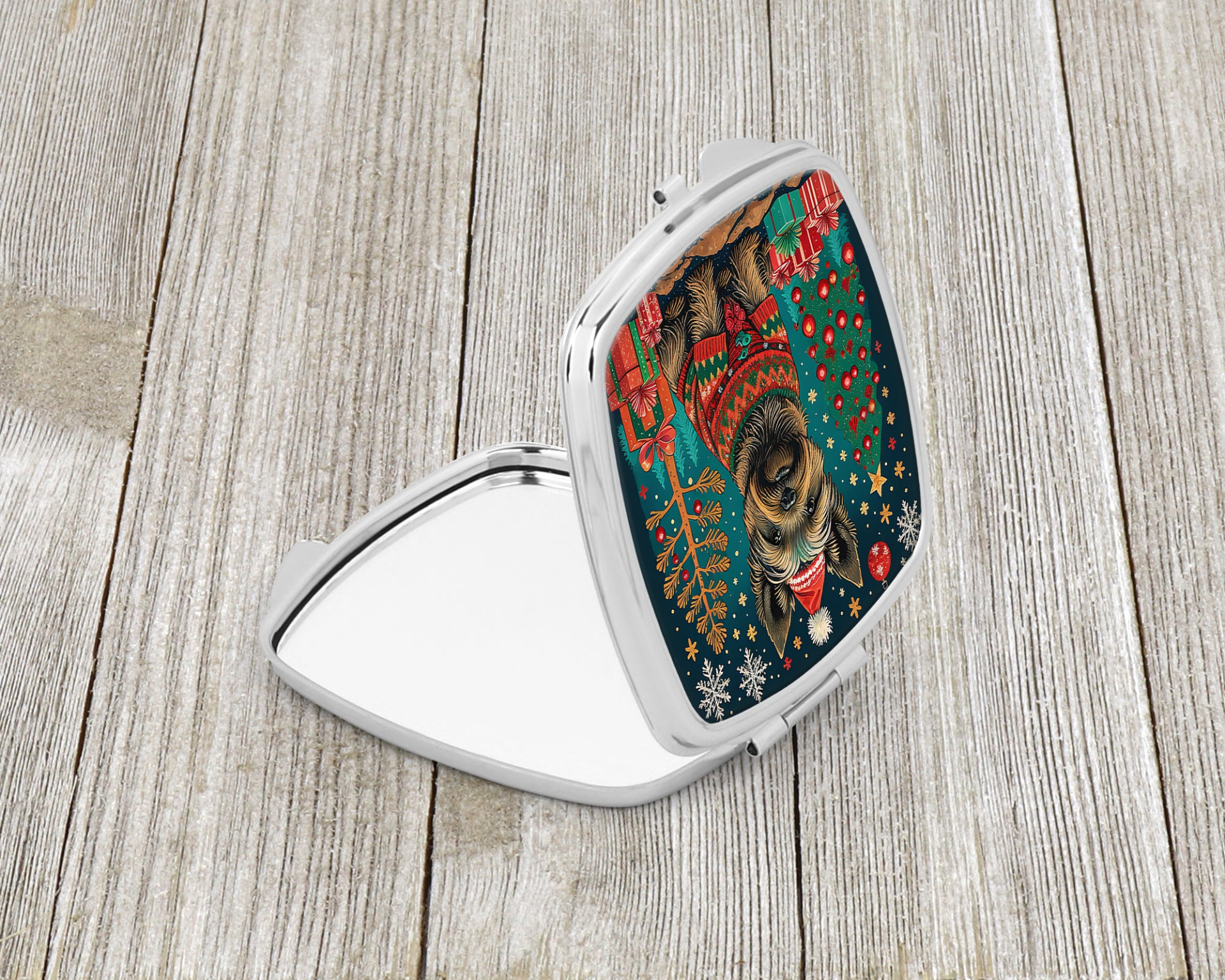 Compact Mirror featuring breed specific Cairn Terrier artwork. Celebrate Christmas with this Christmas Compact Mirror. Introducing our Square Compact Mirror, a blend of elegance, functionality, and compactness, perfect for on-the-go touch-ups. This Silvertone metal mirror, with dimensions of 2.75 inches x 3 inches x .3 inches, fits effortlessly into your purse, handbag, or pocket, ensuring that you can check your appearance anytime, anywhere. Our compact mirror stands out with its eye-catching artwork on the front, adding a dash of style to this practical accessory. It is more than just a mirror; it's a statement piece that reflects your personality and aesthetic. When opened, this compact reveals two mirrors inside, doubling your perspective for precise touch-ups. The Silvertone metal construction ensures durability while maintaining a lightweight feel, making it an ideal everyday carry item. Whether you're rushing to a meeting, prepping for a dinner date, or just need a quick check on your look, our Square Compact Mirror is your reliable companion. Experience the perfect blend of style and practicality with this must-have accessory.