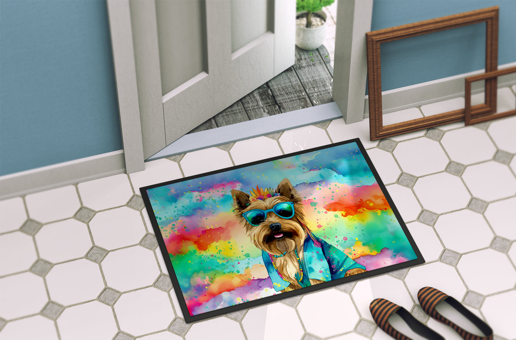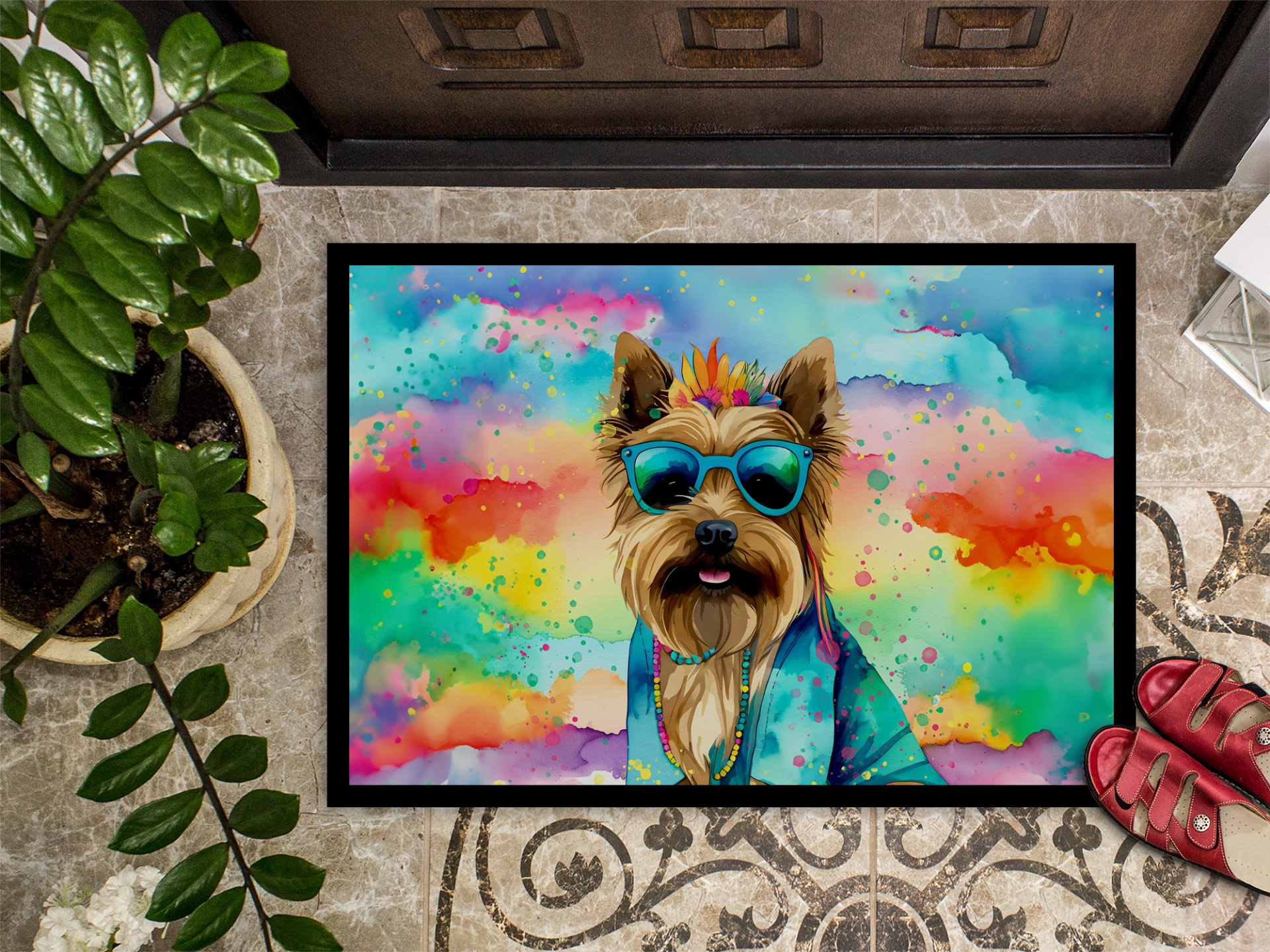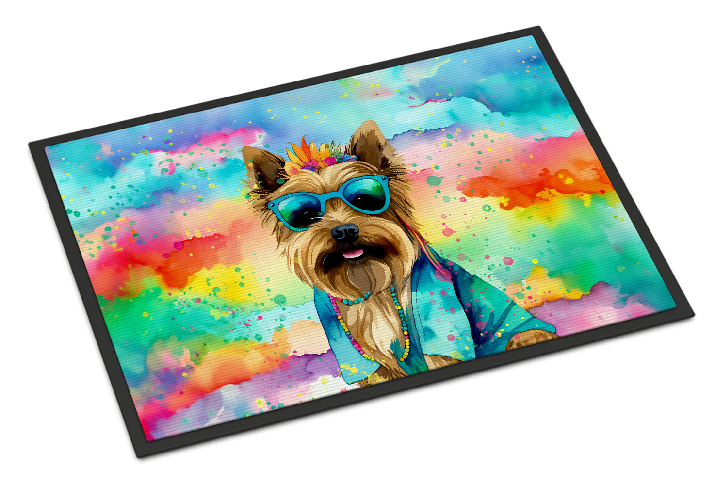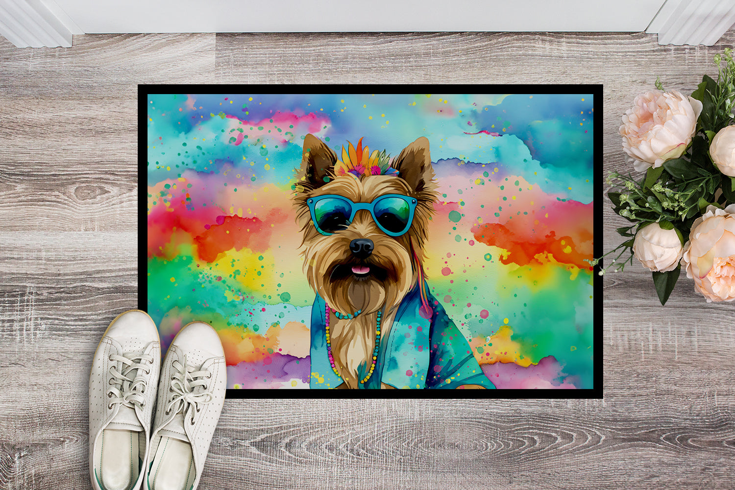 Doormat featuring breed specific Cairn Terrier artwork. Welcome your guests in style with our Artwork Door Mat, designed to withstand almost any weather condition. This mat, measuring approximately 18 by 27 inches, is held together by durable black binding tape. Its top layer, composed of polyester felt, is dyed with the eye-catching image you see on the mat. A few layers below provide the mat with stability, while its rubber bottom is stamped to help prevent slipping and ensures safety. Our mat works wonderfully as both an indoor or outdoor door mat. For cleaning, simply hose it off with water or use a power washer - no need for any cleaner that produces suds. Avoid scrubbing with a brush, instead, opt for the vacuum on floor setting. Designed manufactured and printed in the USA, this mat is a perfect addition to your porch, outdoor kitchen, entryway, or any indoor space. Its unique design makes it a charming decorative rug that greets your guests and adds a stylish touch to your home decor.