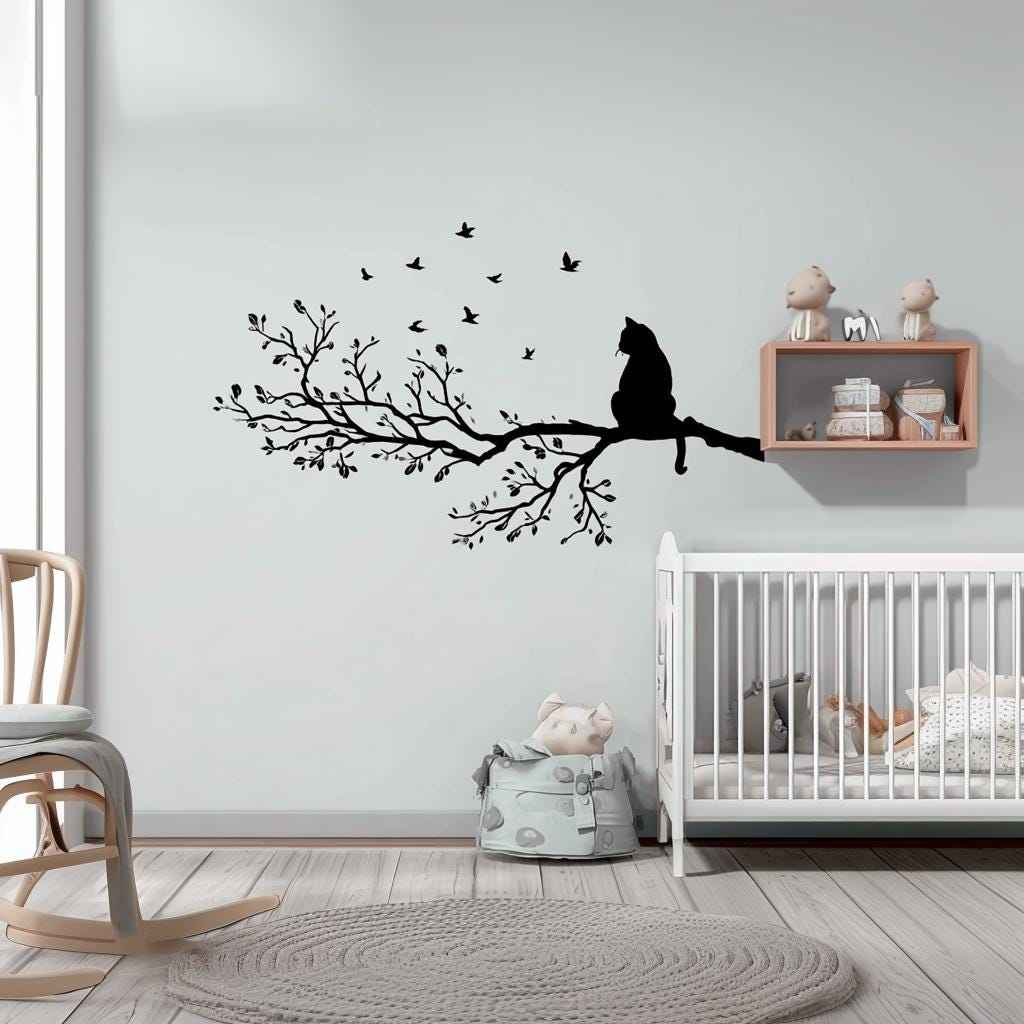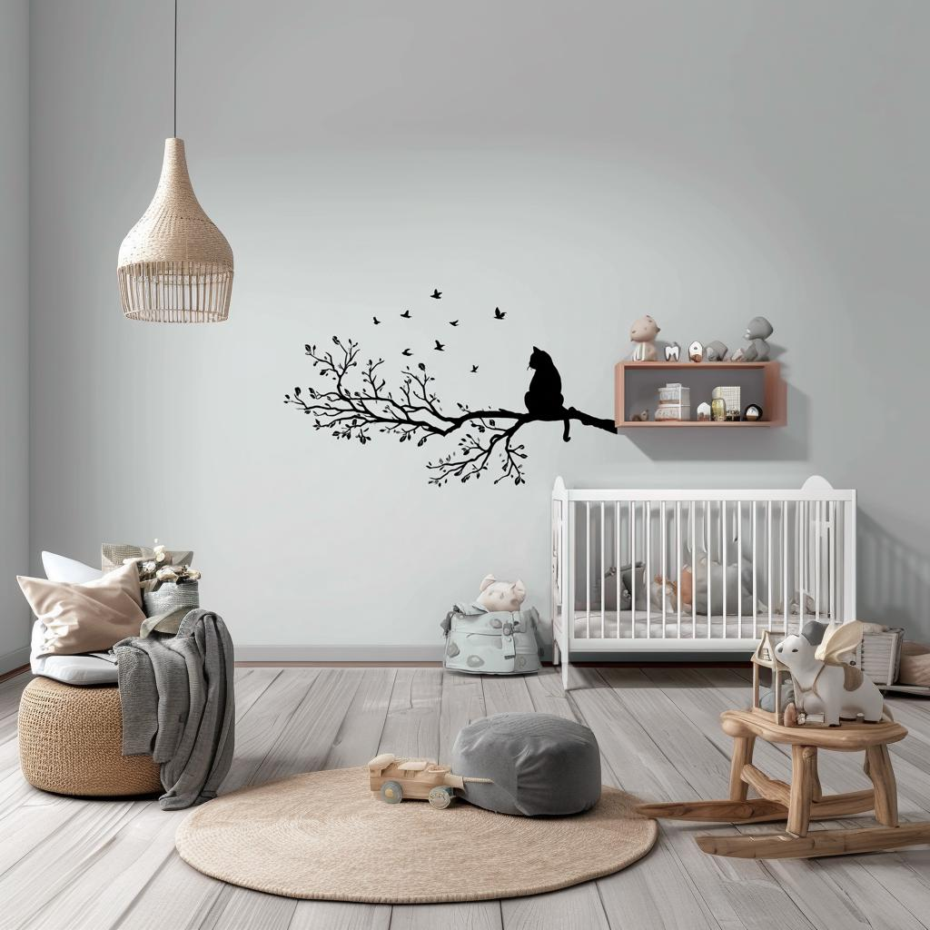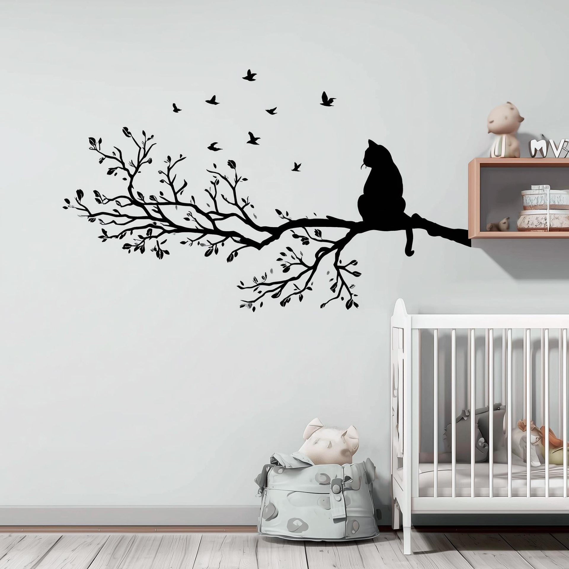 This peaceful wall decal features a cat sitting on a tree branch surrounded by flying birds. The natural design brings a calming and whimsical presence to any room and is ideal for nurseries, bedrooms, or reading corners.