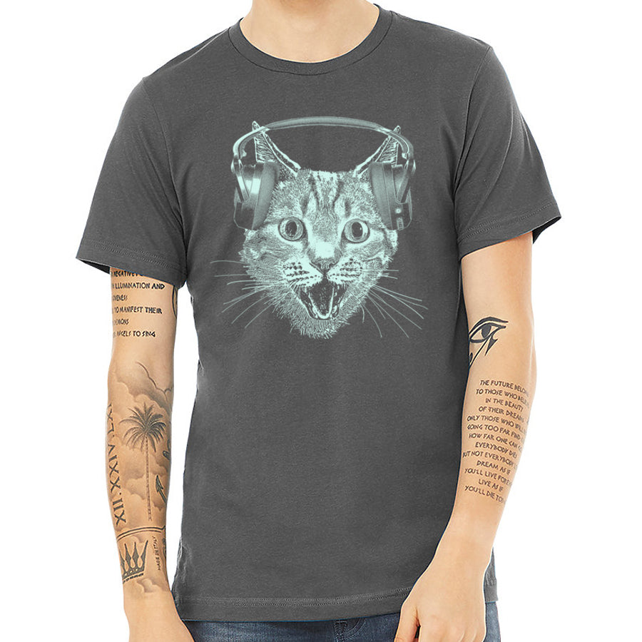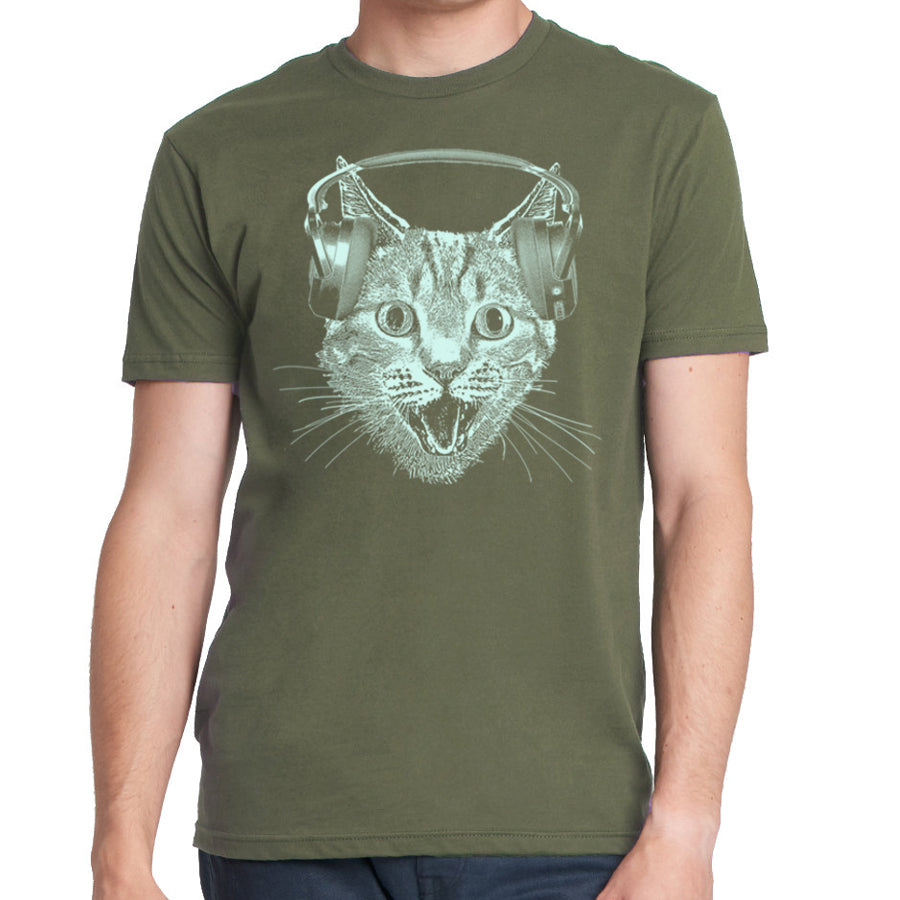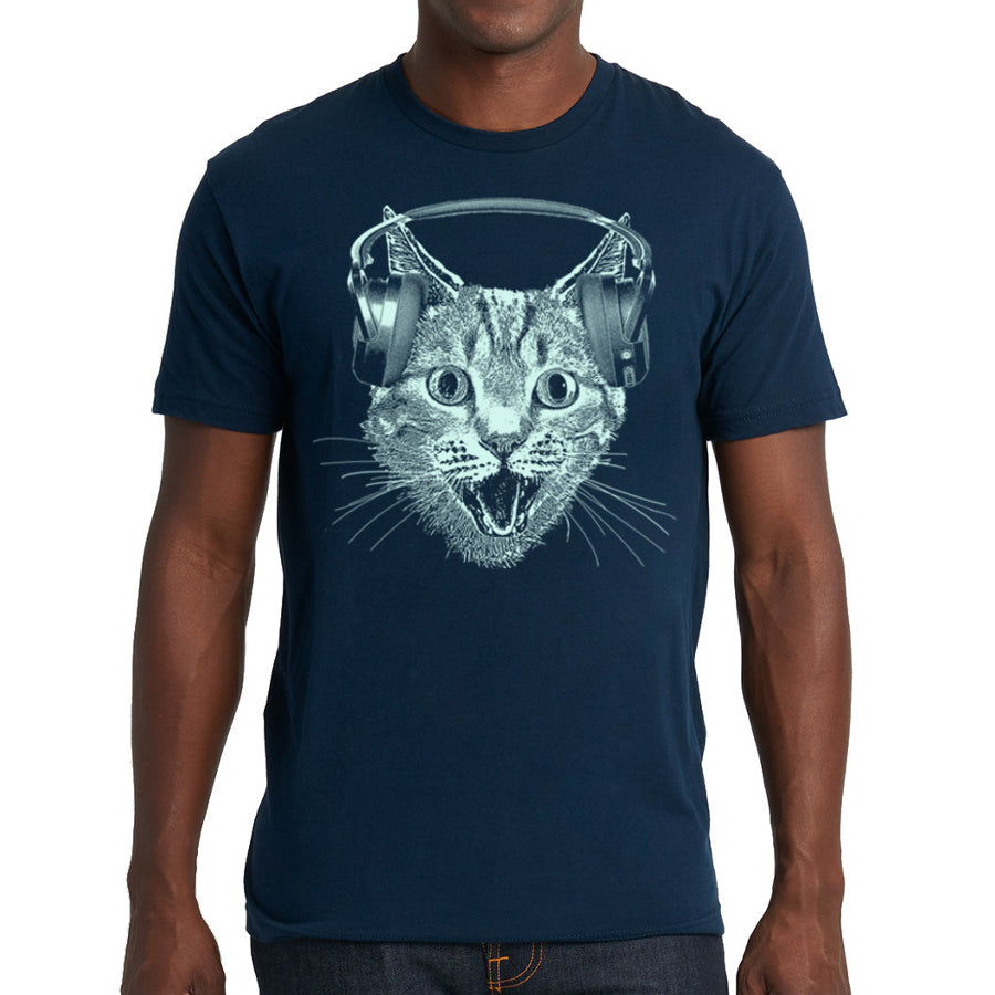 Cat Wearing Headphones Men's Tshirt- Cat DJ Shirt For Men and Boys- Music Lover Kitty Design- Funny Feline Graphic Tee