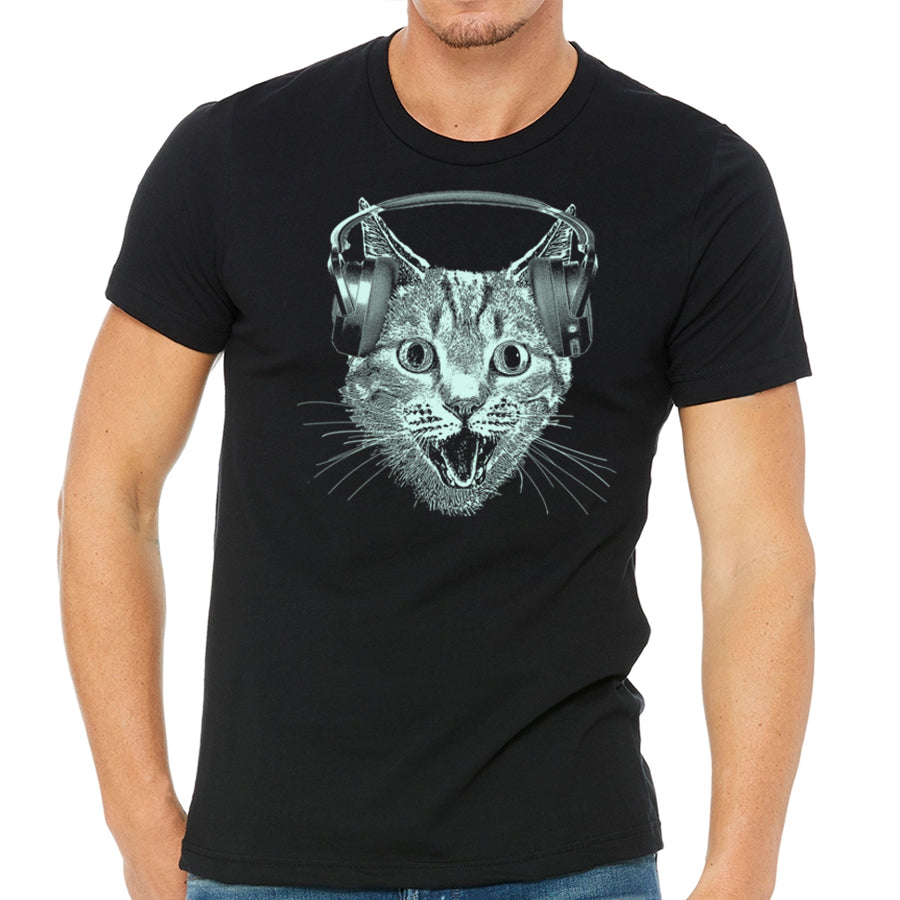 Cat Wearing Headphones Men's Tshirt- Cat DJ Shirt For Men and Boys- Music Lover Kitty Design- Funny Feline Graphic Tee - Small / black is backordered and will ship as soon as it is back in stock.