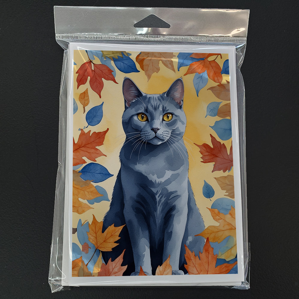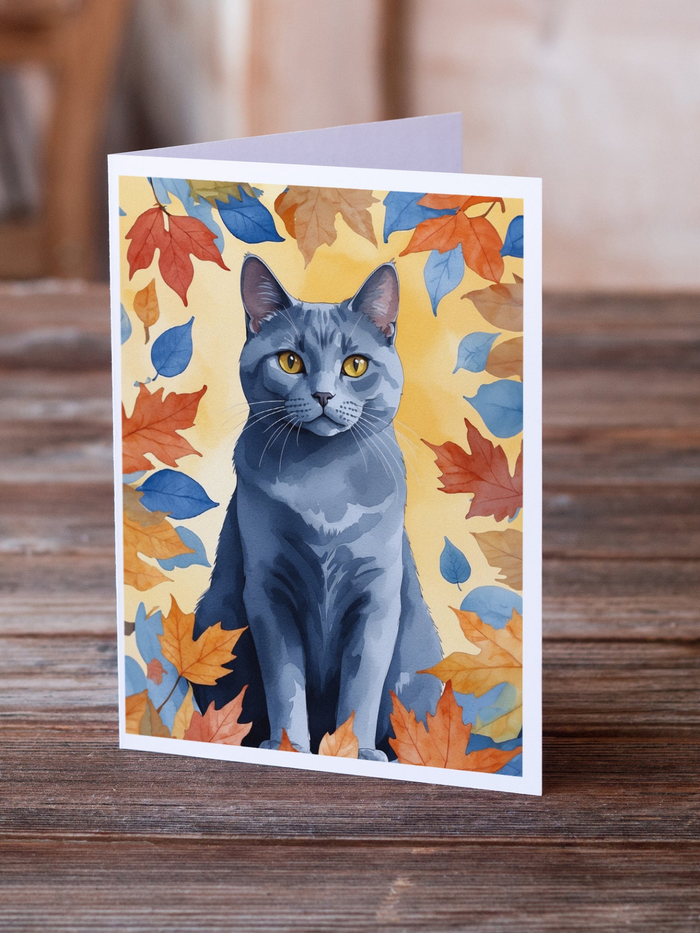 Chartreux Cat in Fall Leaves Greeting Cards Pack of 8