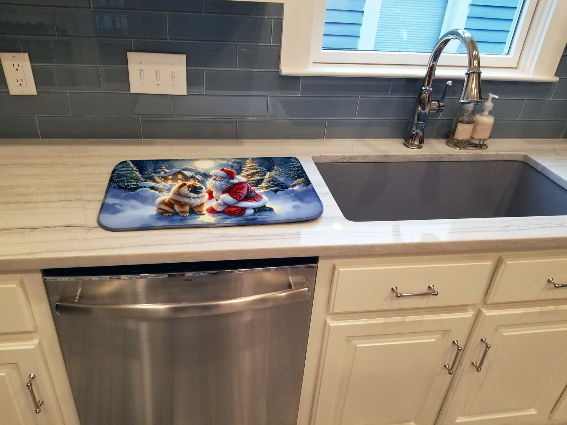 Dish Drying Mat featuring breed specific Chow Chow artwork. Celebrate Christmas with this Christmas Dish Drying Mat. Say goodbye to messy countertops and soggy dish towels with our innovative dish drying mat. Our high-quality dish drying pad is designed to keep your countertops dry while offering a stylish and efficient solution. Whether you're air drying dishes, glasses, stemware, silverware, pots, pans, bottles, or even fruits and vegetables, our dish mat is the perfect choice. The 14 inches x 22 inches size fits most counters and dish drying racks, and the non-slip design ensures stability. Made with water-absorbent polyester and a polyurethane foam insert, our dish drying mat is not only functional but also durable. It's machine washable and printed in the USA for long-lasting use. The beautiful artwork adds flair to your kitchen decor, making it a perfect housewarming gift or present for any occasion. Upgrade your kitchen experience with our absorbent and versatile dish drying mat.