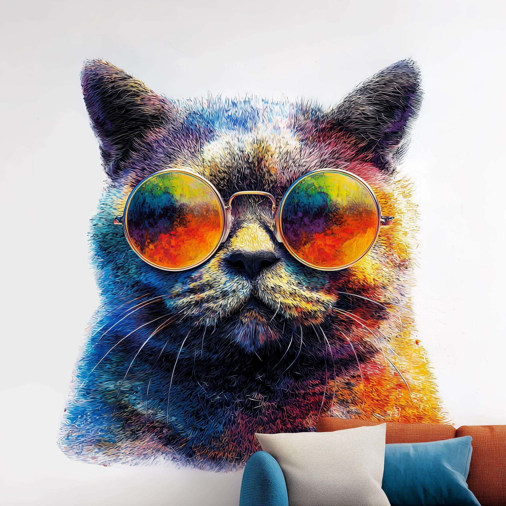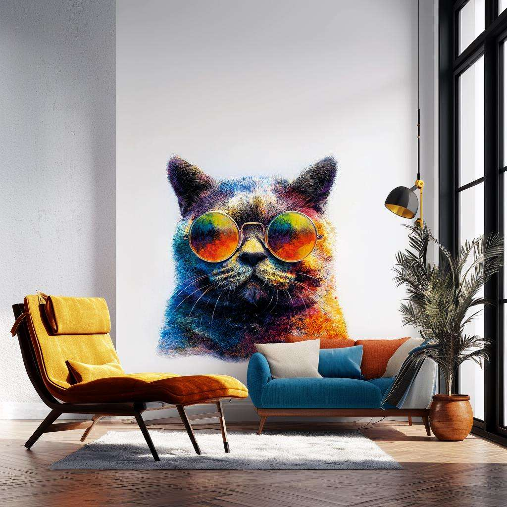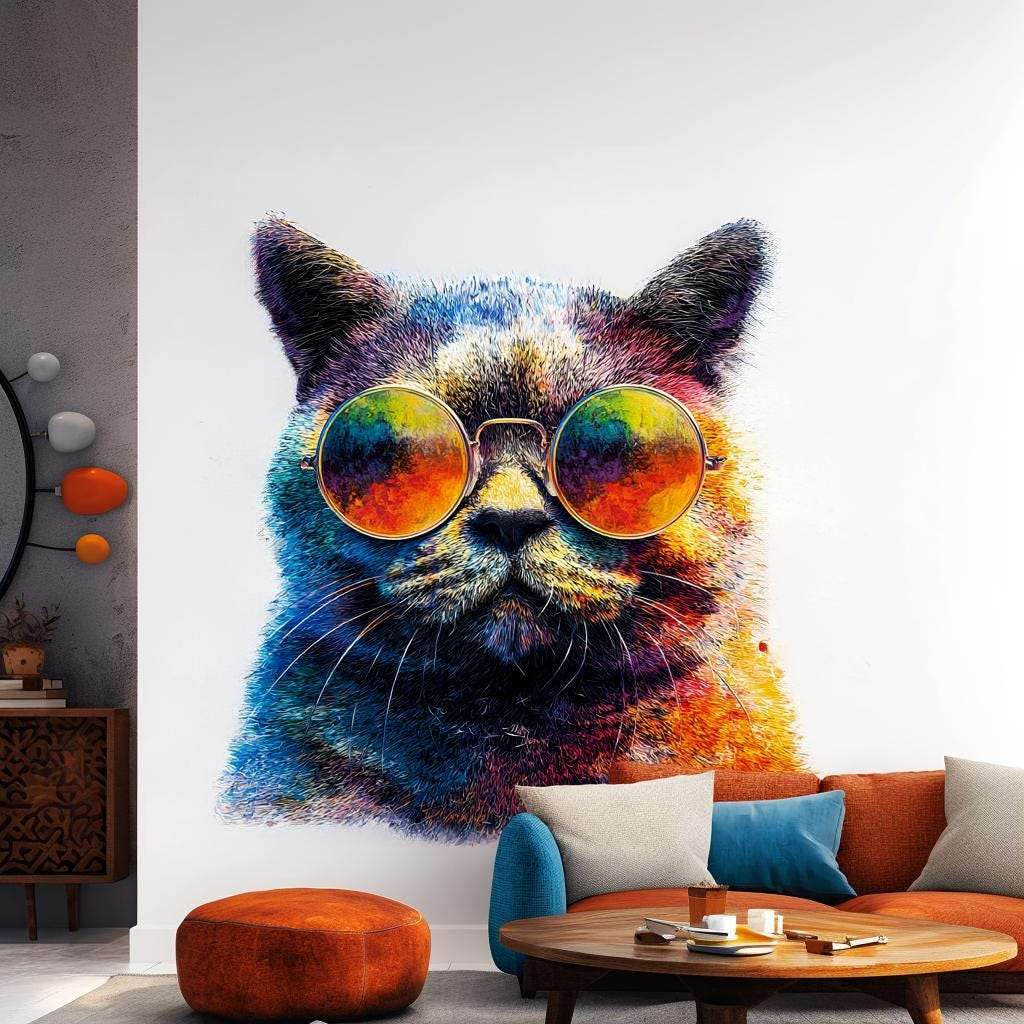 This vibrant wall decal features a confident cat in bright sunglasses, printed in full color to bring life and energy to your space. Whether you're decorating a teen bedroom, creative studio, or quirky hallway, this eye-catching design makes a bold, modern statement.