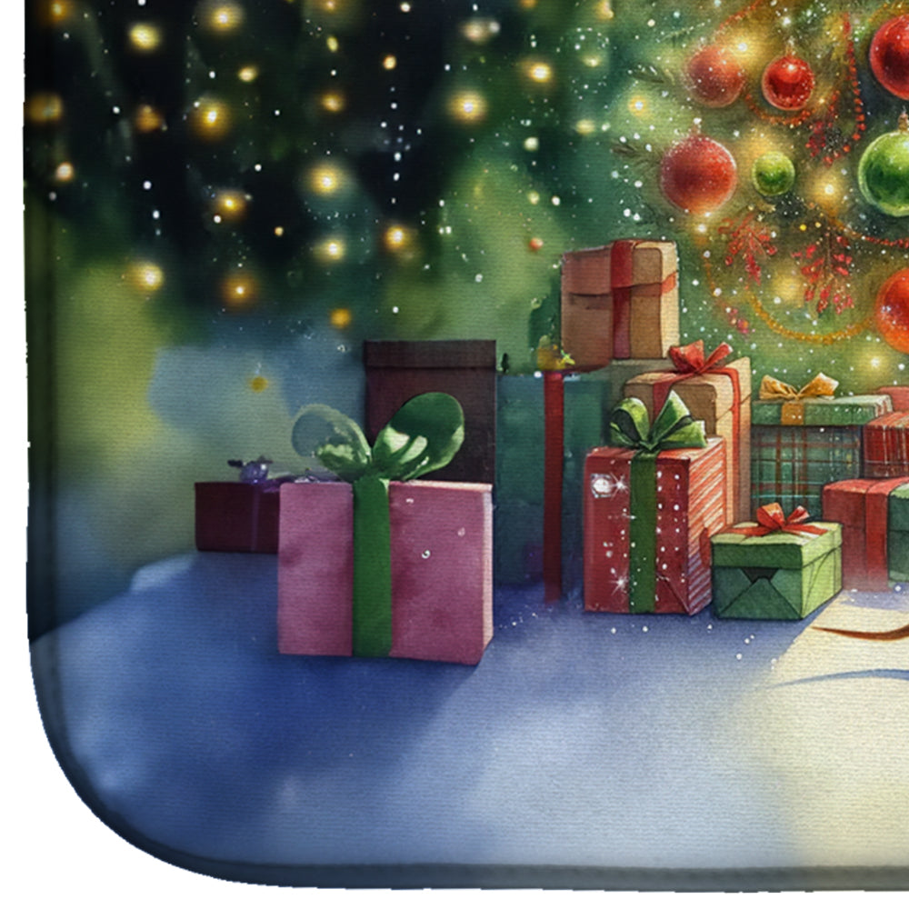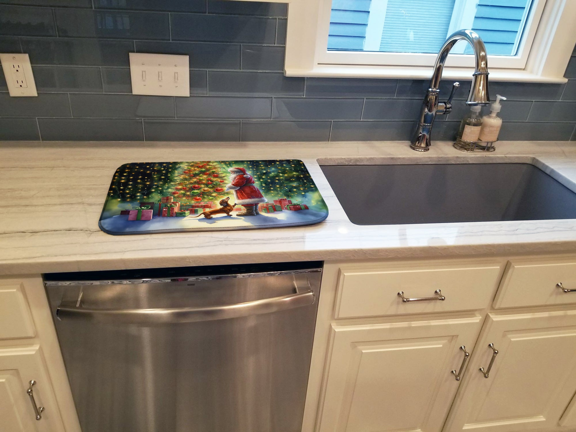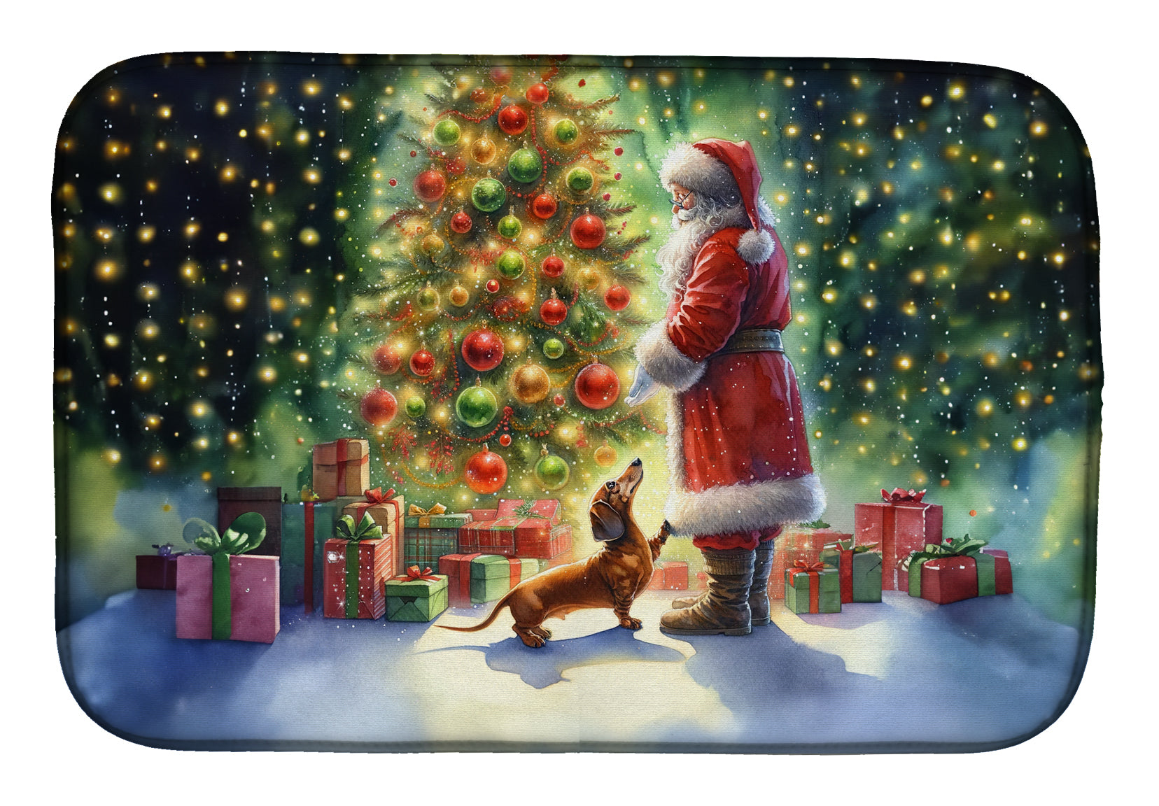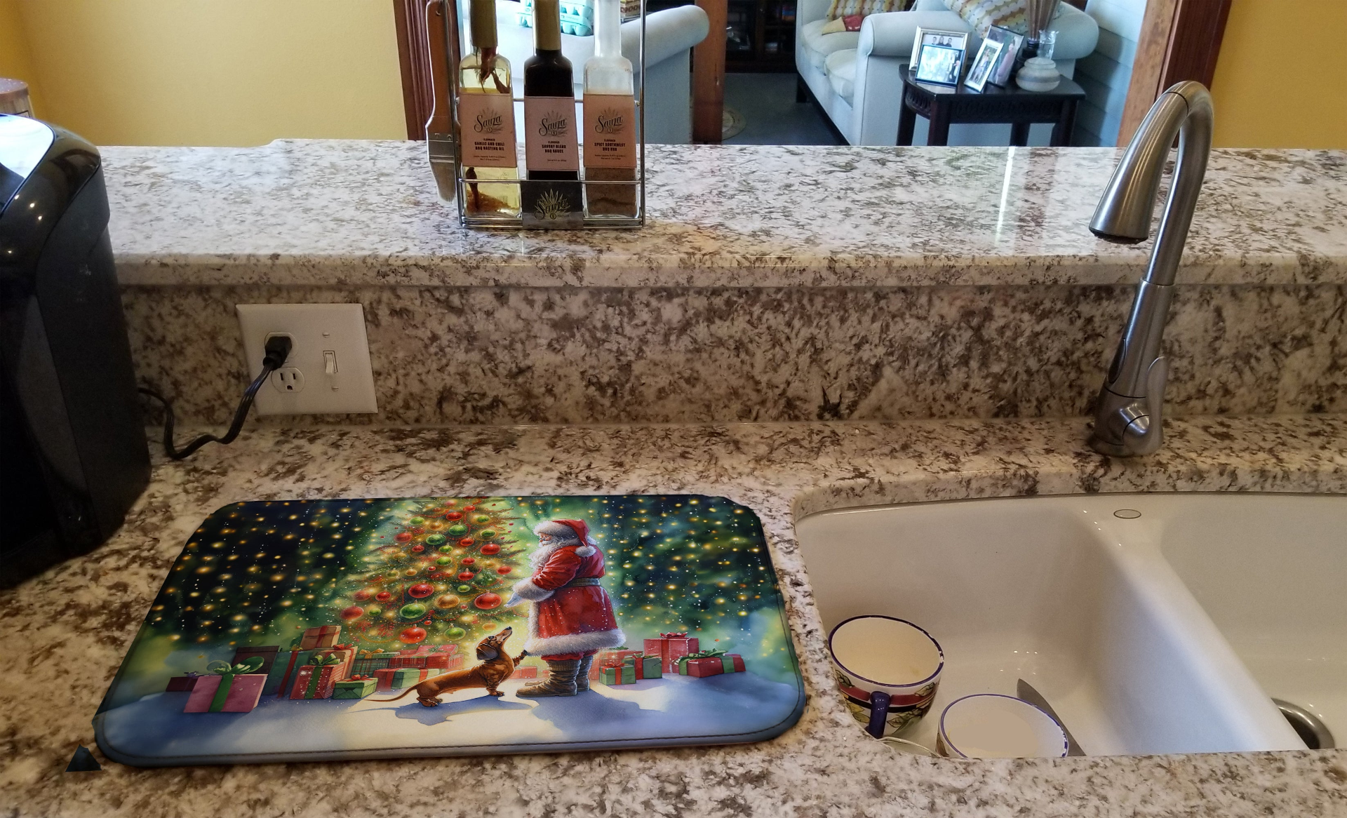 Dish Drying Mat featuring breed specific Dachshund artwork. Celebrate Christmas with this Christmas Dish Drying Mat. Say goodbye to messy countertops and soggy dish towels with our innovative dish drying mat. Our high-quality dish drying pad is designed to keep your countertops dry while offering a stylish and efficient solution. Whether you're air drying dishes, glasses, stemware, silverware, pots, pans, bottles, or even fruits and vegetables, our dish mat is the perfect choice. The 14 inches x 22 inches size fits most counters and dish drying racks, and the non-slip design ensures stability. Made with water-absorbent polyester and a polyurethane foam insert, our dish drying mat is not only functional but also durable. It's machine washable and printed in the USA for long-lasting use. The beautiful artwork adds flair to your kitchen decor, making it a perfect housewarming gift or present for any occasion. Upgrade your kitchen experience with our absorbent and versatile dish drying mat.
