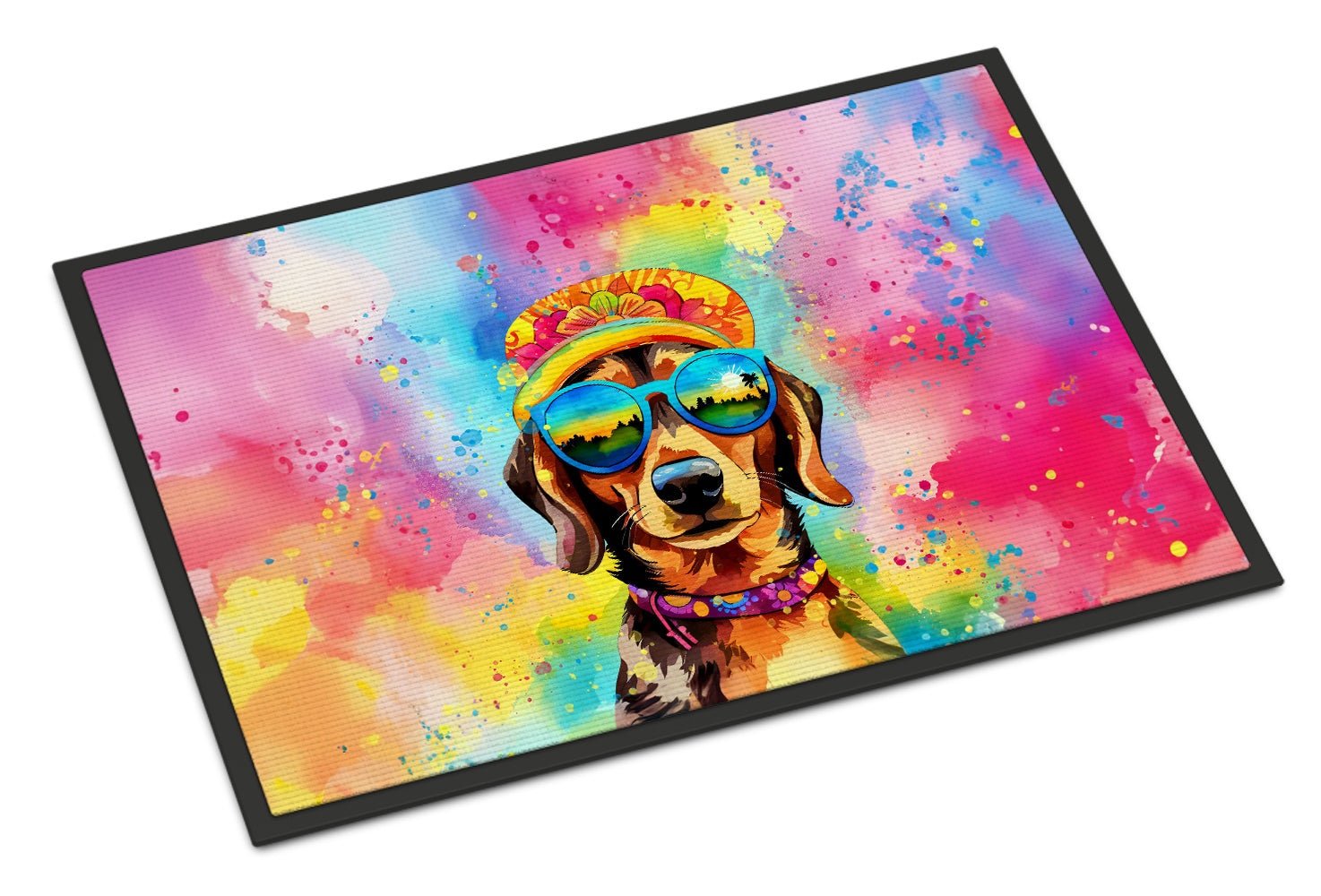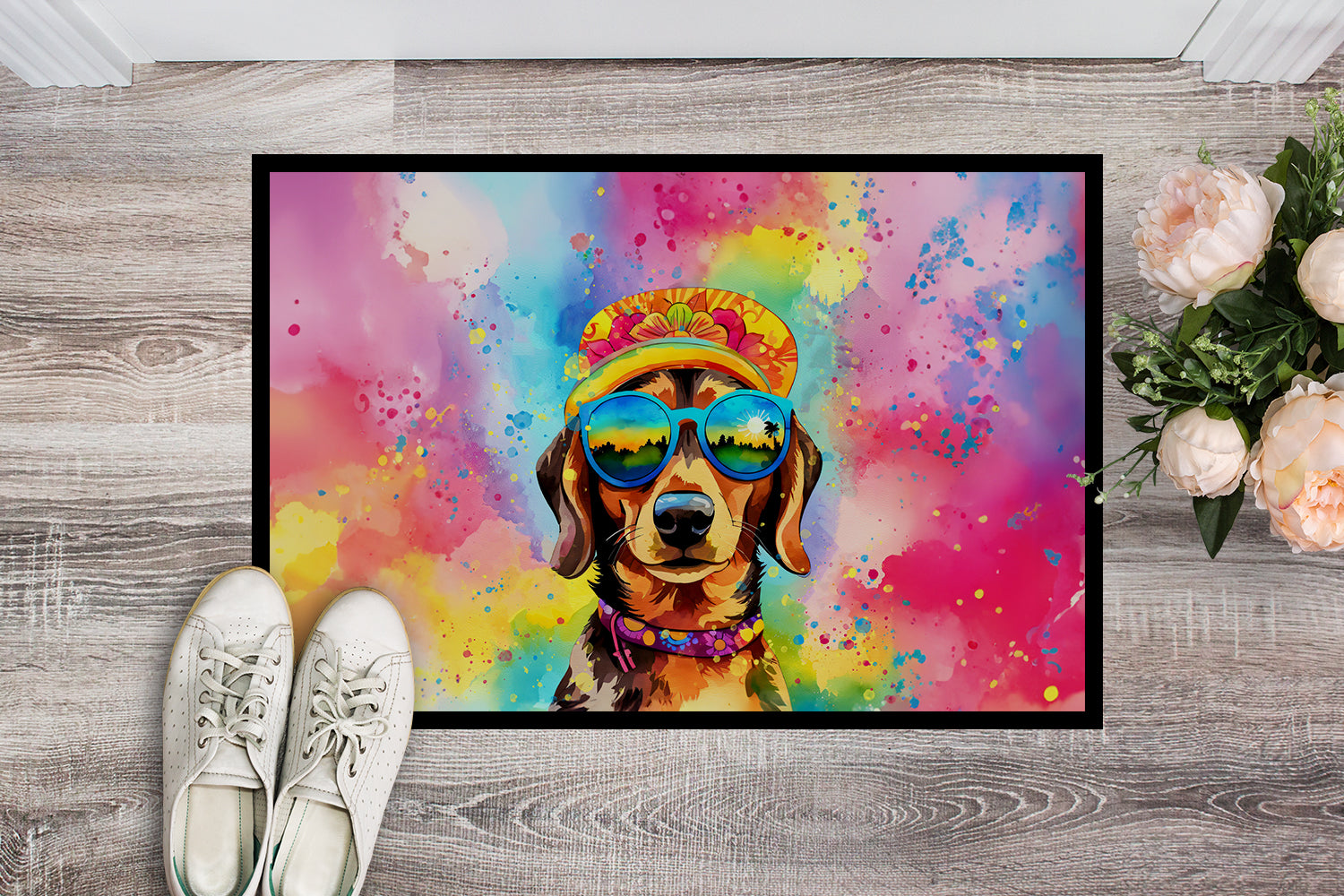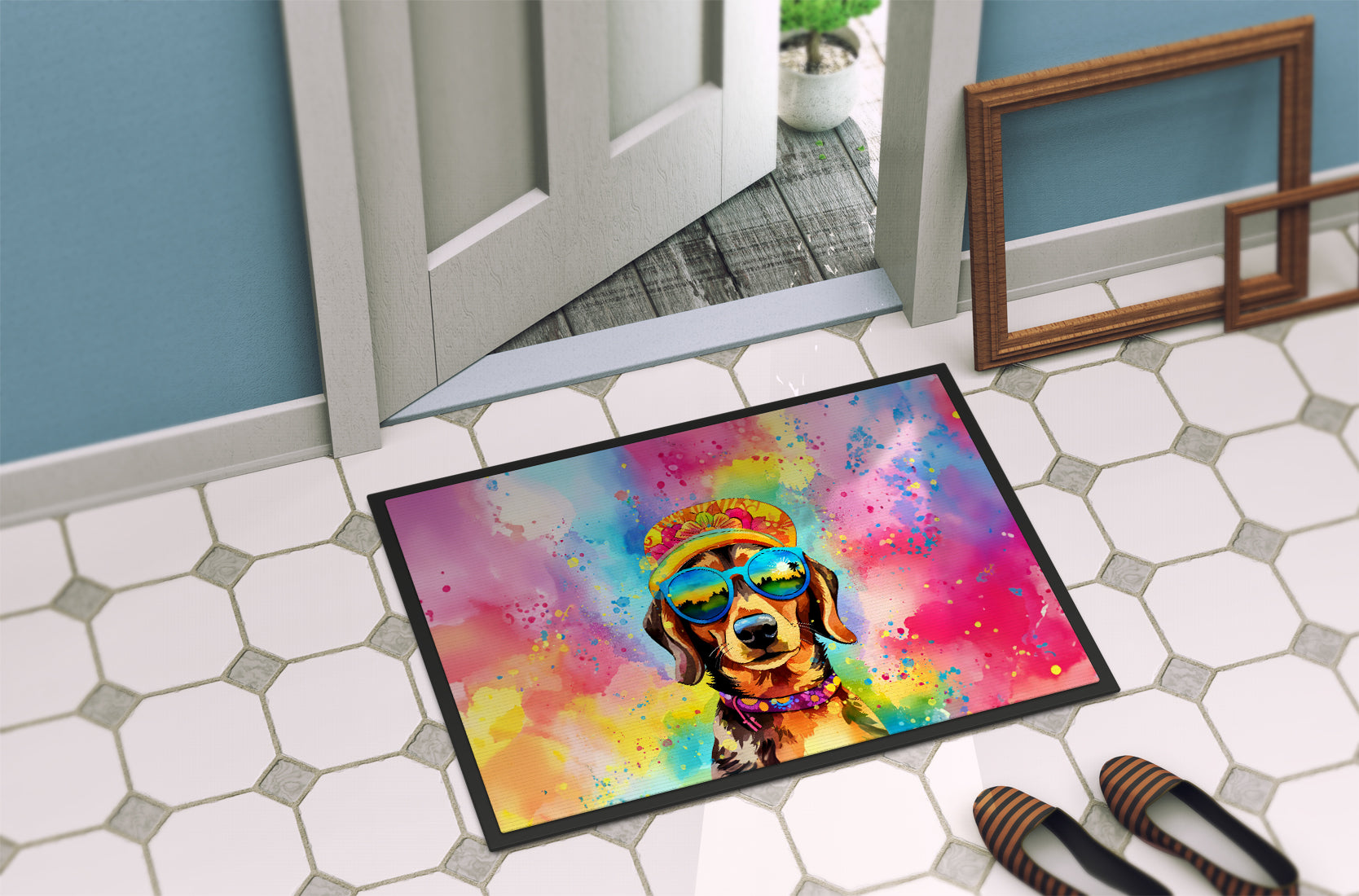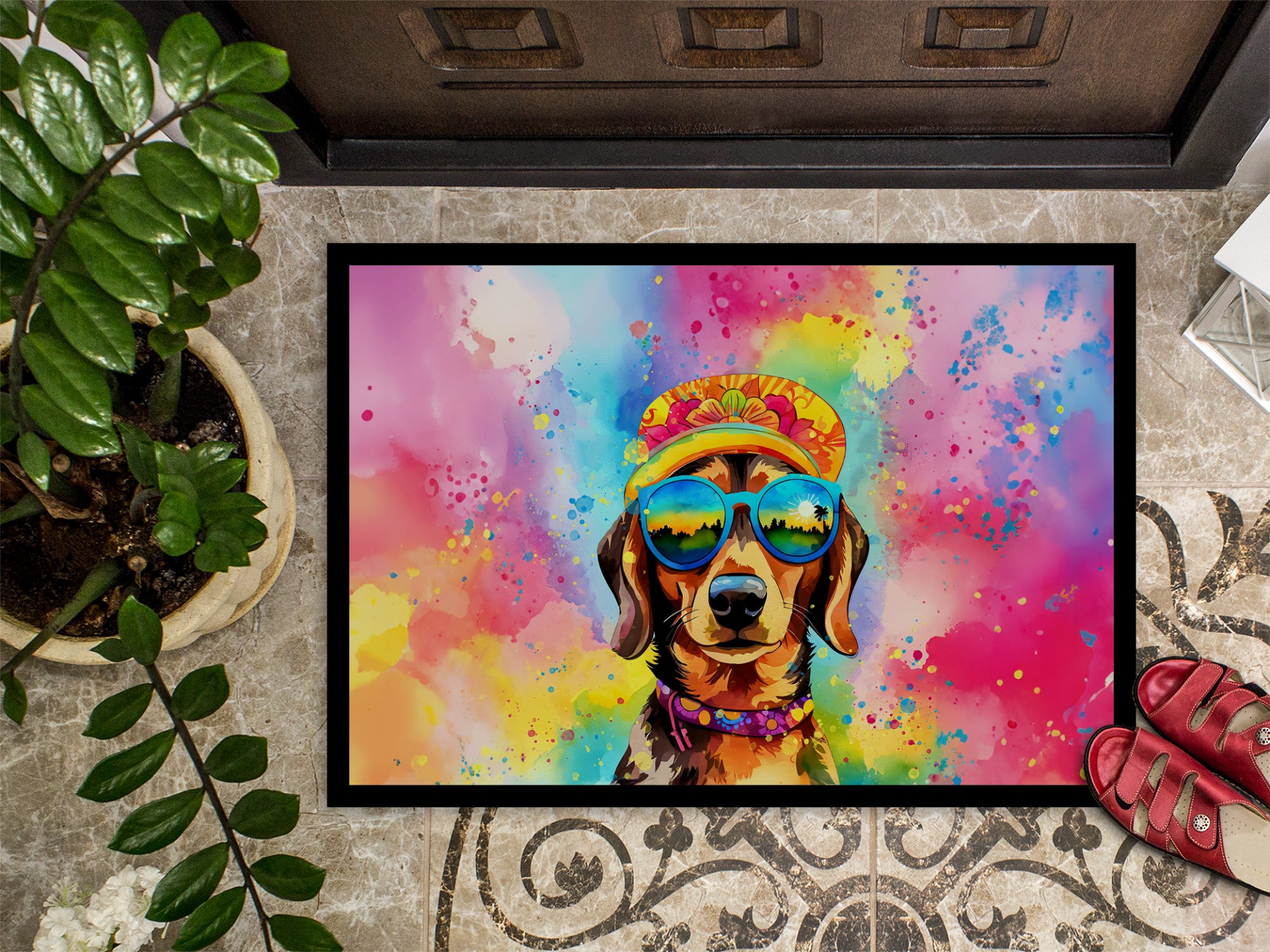 Doormat featuring breed specific Dachshund artwork. Welcome your guests in style with our Artwork Door Mat, designed to withstand almost any weather condition. This mat, measuring approximately 24 by 36 inches, is held together by durable black binding tape. Its top layer, composed of polyester felt, is dyed with the eye-catching image you see on the mat. A few layers below provide the mat with stability, while its rubber bottom is stamped to help prevent slipping and ensures safety. Our mat works wonderfully as both an indoor or outdoor door mat. For cleaning, simply hose it off with water or use a power washer - no need for any cleaner that produces suds. Avoid scrubbing with a brush, instead, opt for the vacuum on floor setting. Designed manufactured and printed in the USA, this mat is a perfect addition to your porch, outdoor kitchen, entryway, or any indoor space. Its unique design makes it a charming decorative rug that greets your guests and adds a stylish touch to your home decor.