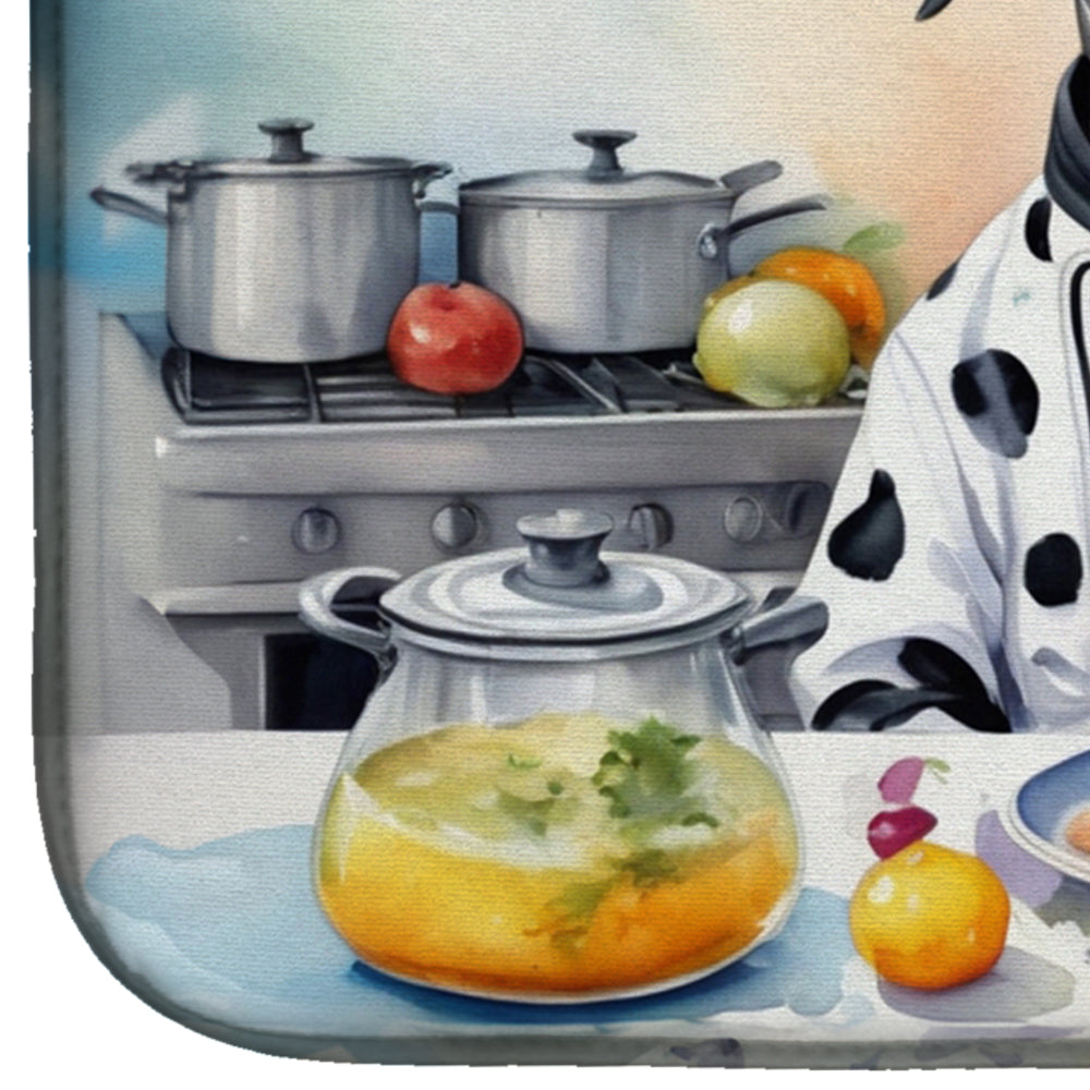 Dish Drying Mat featuring breed specific Dalmatian artwork. Say goodbye to messy countertops and soggy dish towels with our innovative dish drying mat. Our high-quality dish drying pad is designed to keep your countertops dry while offering a stylish and efficient solution. Whether you're air drying dishes, glasses, stemware, silverware, pots, pans, bottles, or even fruits and vegetables, our dish mat is the perfect choice. The 14 inches x 22 inches size fits most counters and dish drying racks, and the non-slip design ensures stability. Made with water-absorbent polyester and a polyurethane foam insert, our dish drying mat is not only functional but also durable. It's machine washable and printed in the USA for long-lasting use. The beautiful artwork adds flair to your kitchen decor, making it a perfect housewarming gift or present for any occasion. Upgrade your kitchen experience with our absorbent and versatile dish drying mat.